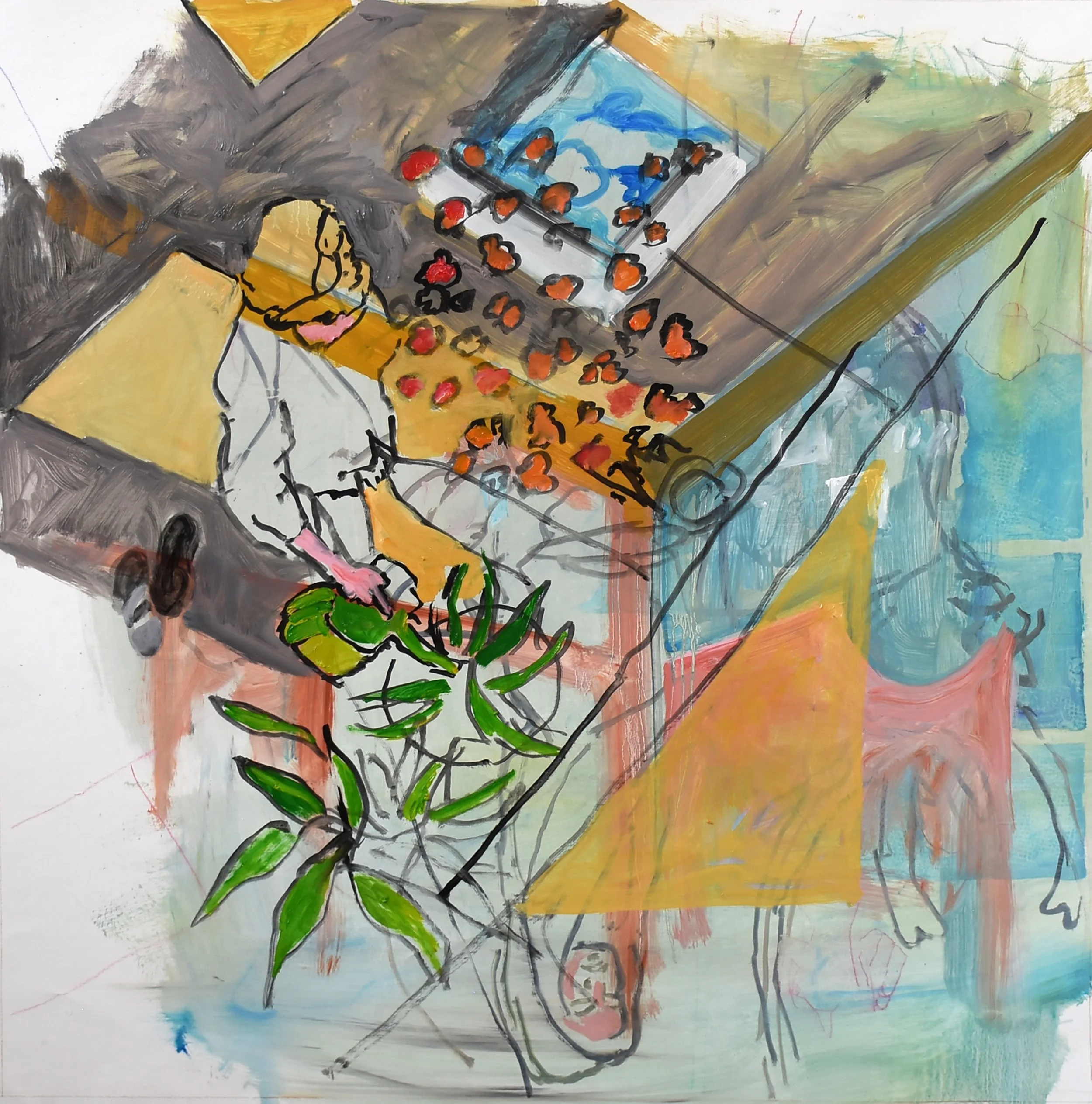 so i cut it in half, and now i’m working on a 32x36” canvas, with the miracle beginnnings flipped upside down and the was, as of now remainting figure standing, as it were , on his head.