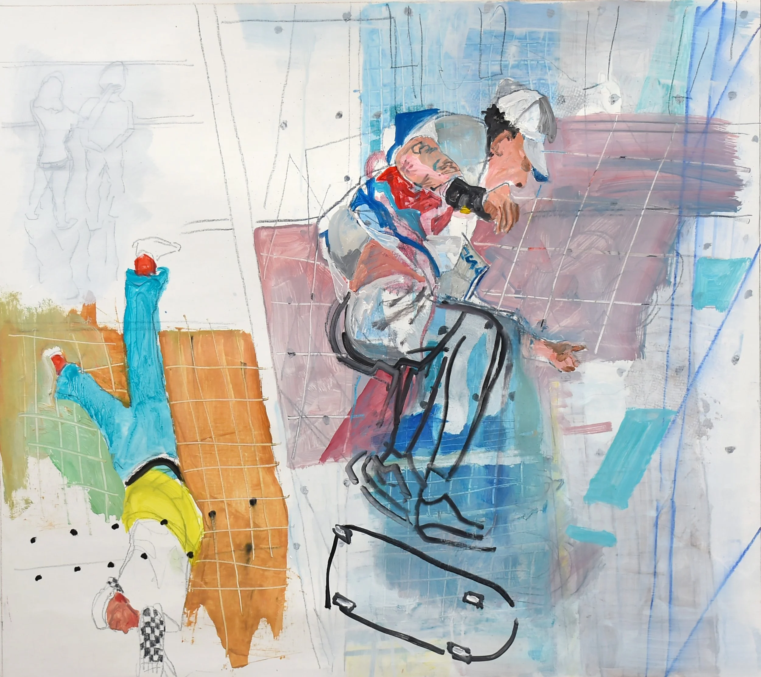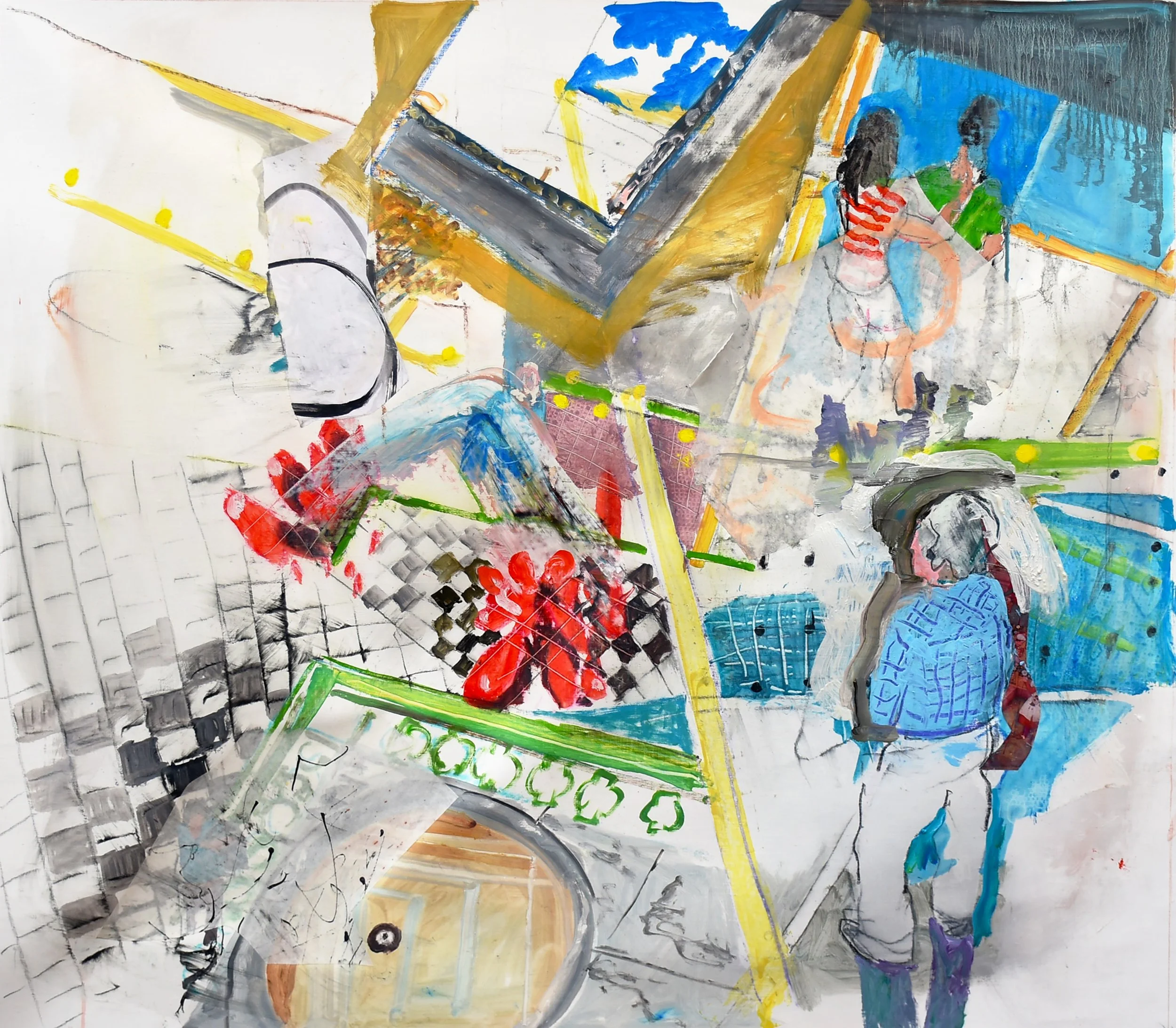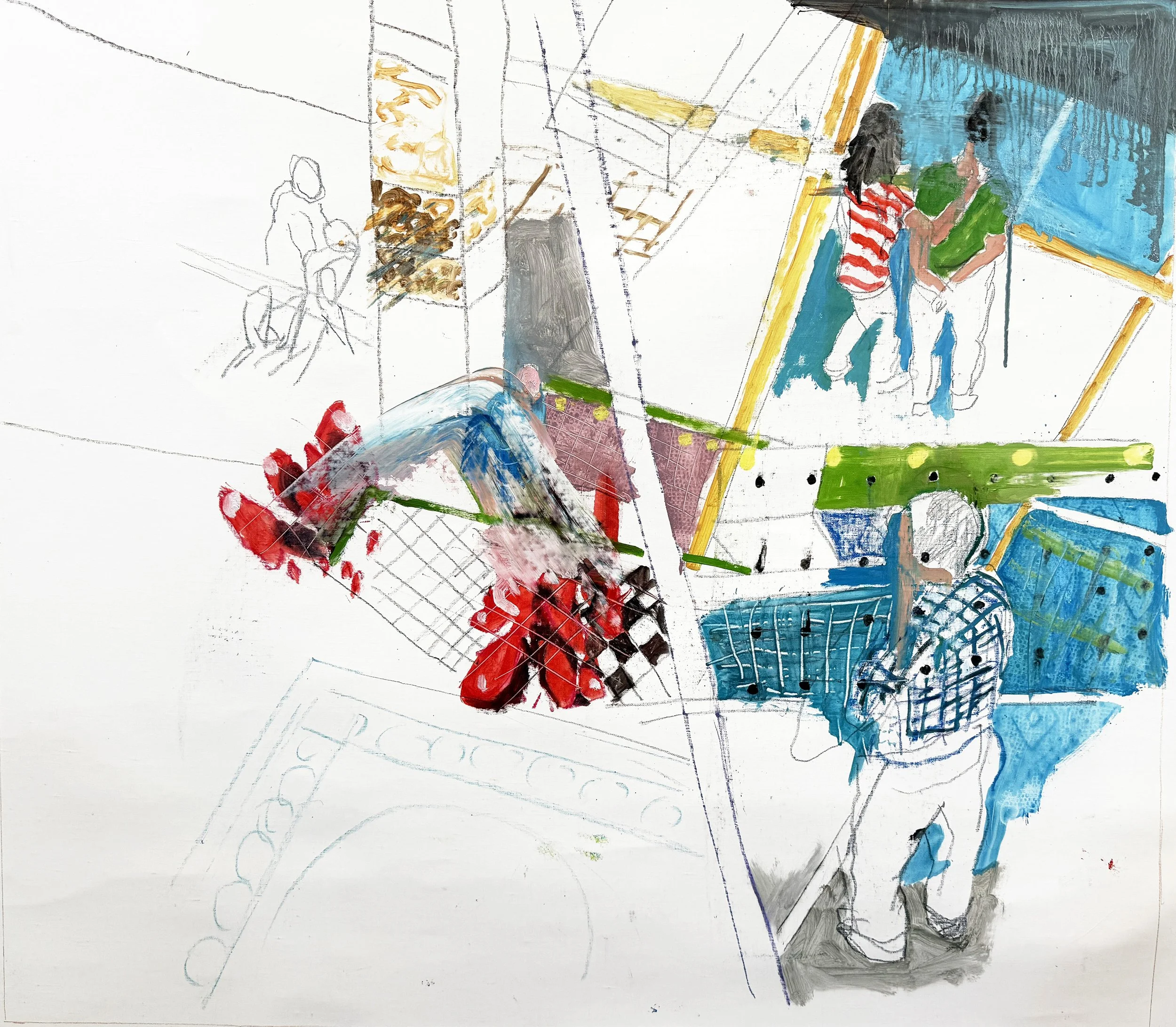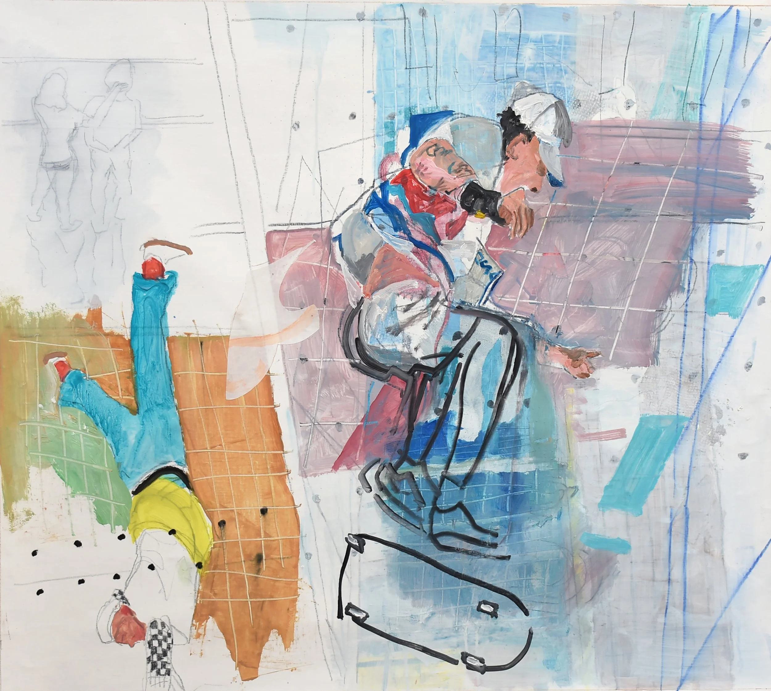 2:14 PM: i made a few slight but significant tweaks to "5/27/25 ano kato" today. i added a collaged piece on paper just behind the skateboarder’s behind, and added a deliniation of the handstander’s shoes.. other than that, the handstander and the colors surrounding him are perfect. and tat small piece of collaged paper is all that was needed to connect the right and left sides of the composition. for now, i’m not going to do any more, and see how i feel about it after having it up on my painting wall for a week or so. so tomorrow morning i’ll start something new.