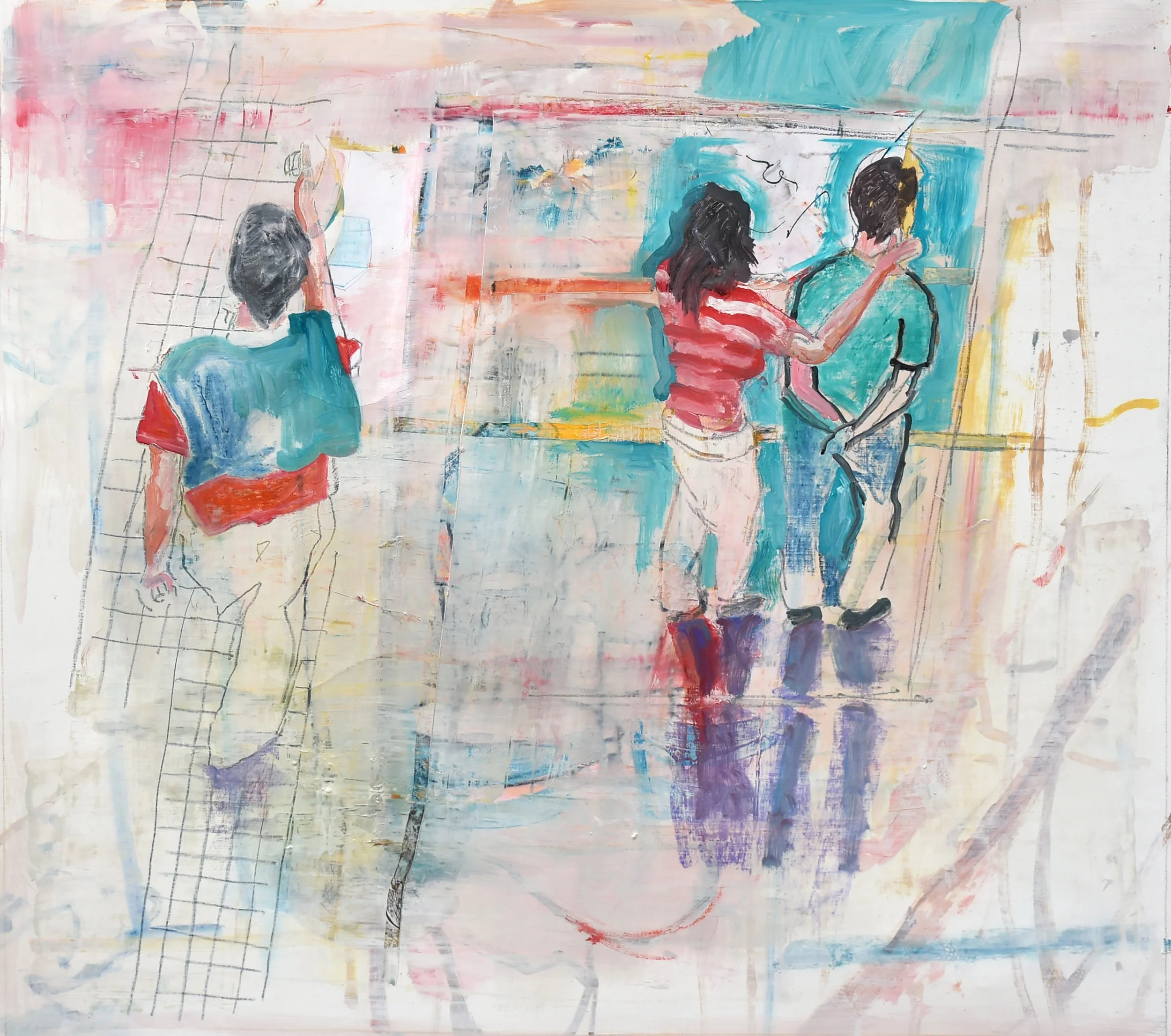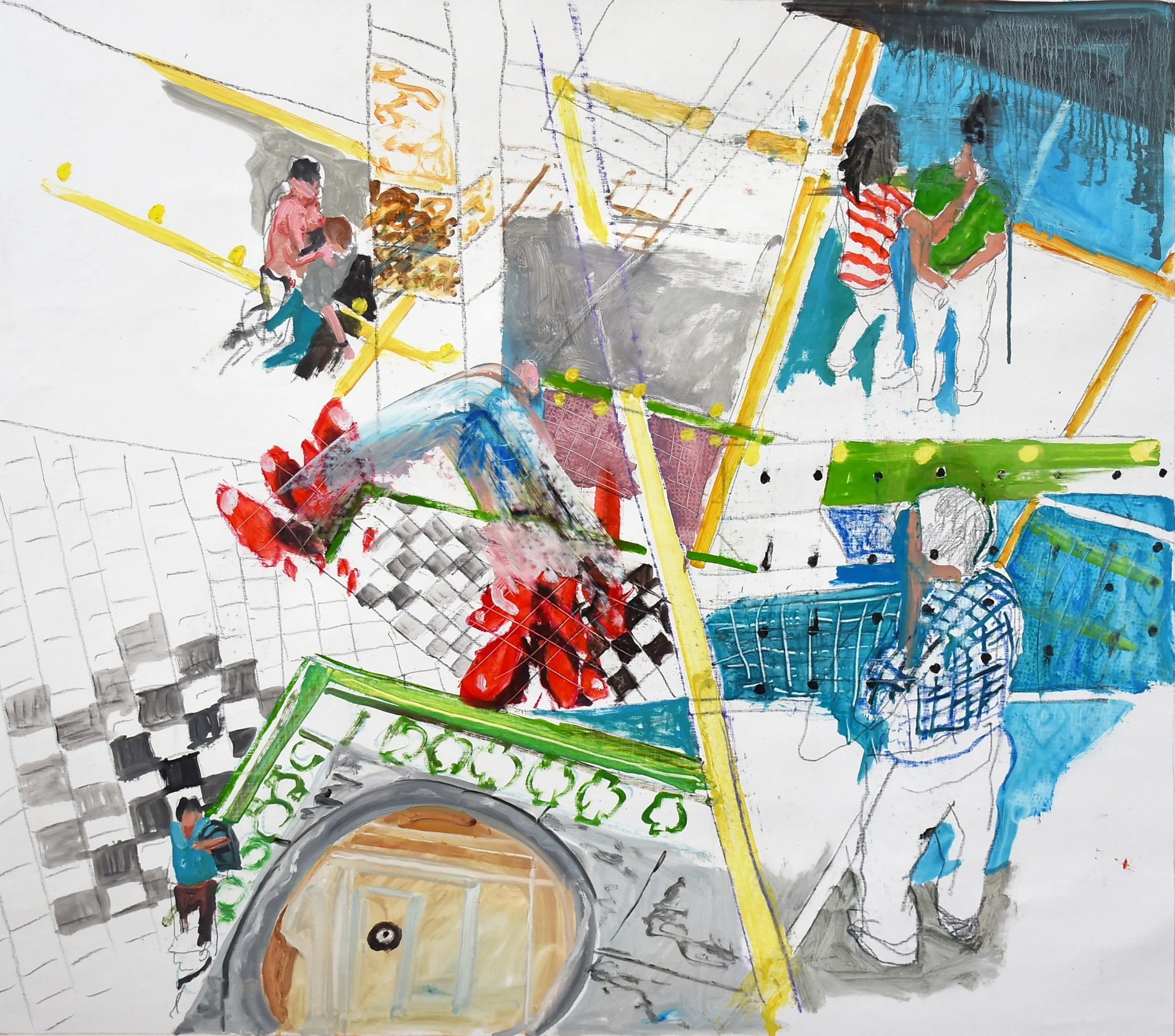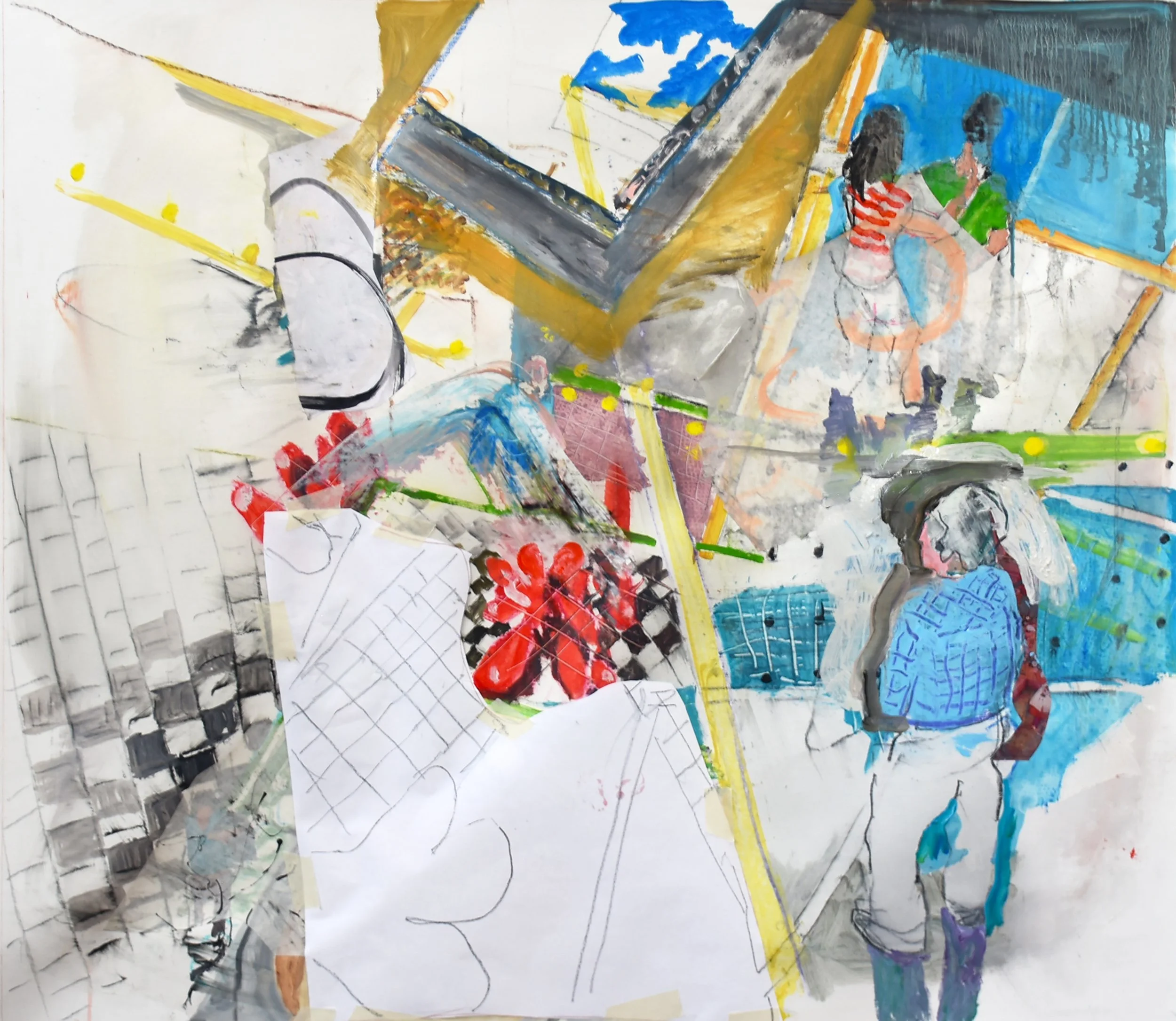 2:14 PM: i made a few slight but significant tweaks to "5/27/25 ano kato" today. i added a collaged piece on paper just behind the skateboarder’s behind, and added a deliniation of the handstander’s shoes.. other than that, the handstander and the colors surrounding him are perfect. and tat small piece of collaged paper is all that was needed to connect the right and left sides of the composition. for now, i’m not going to do any more, and see how i feel about it after having it up on my painting wall for a week or so. so tomorrow morning i’ll start something new.