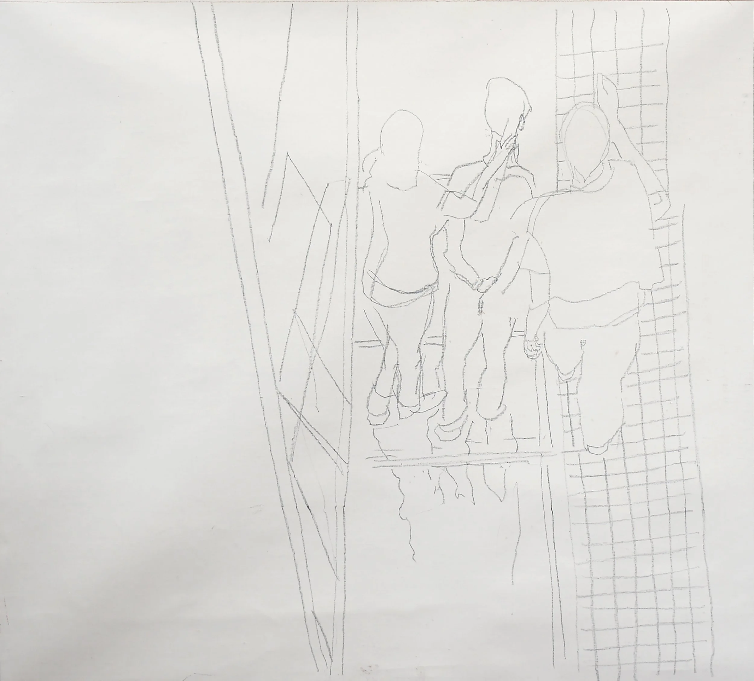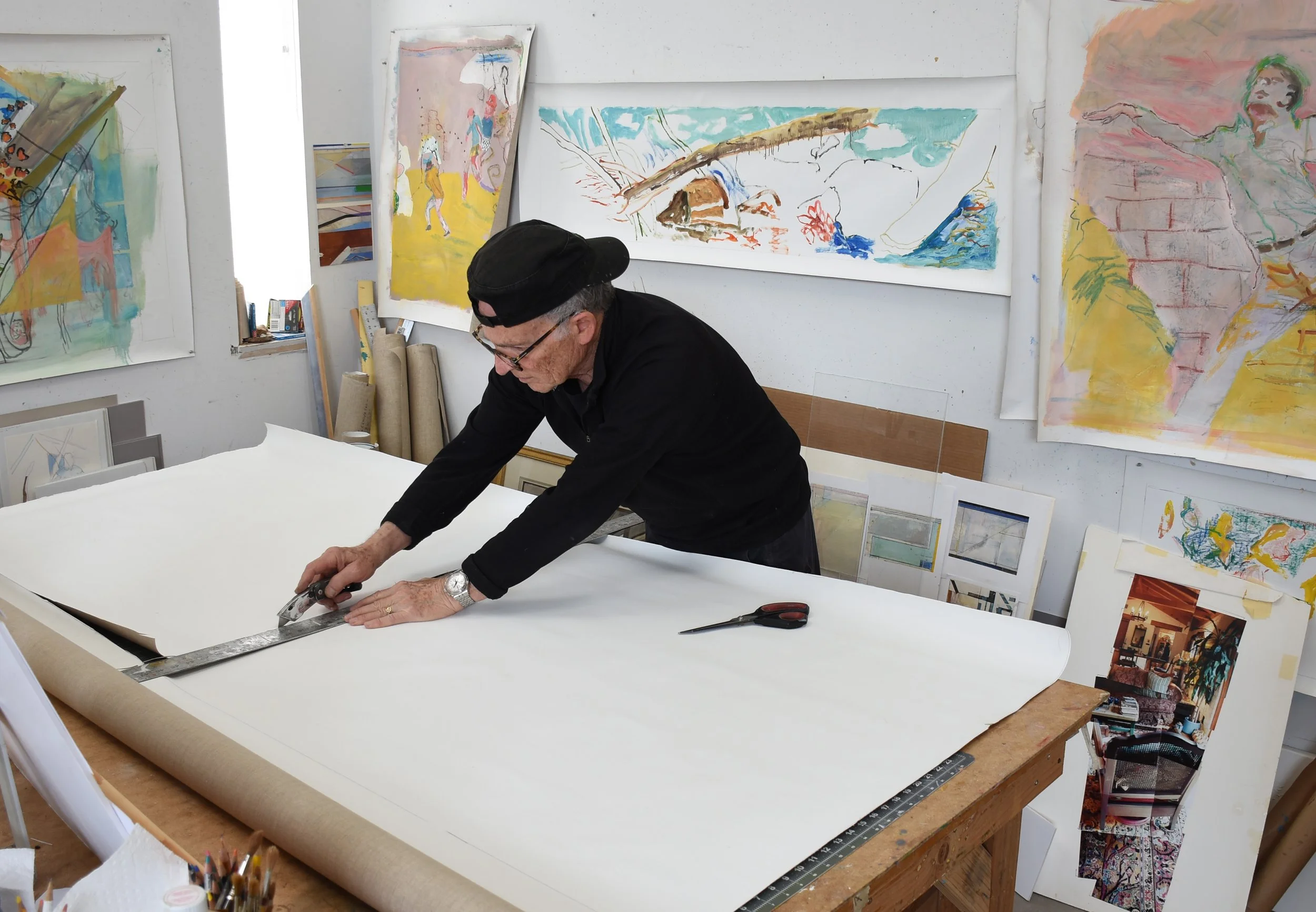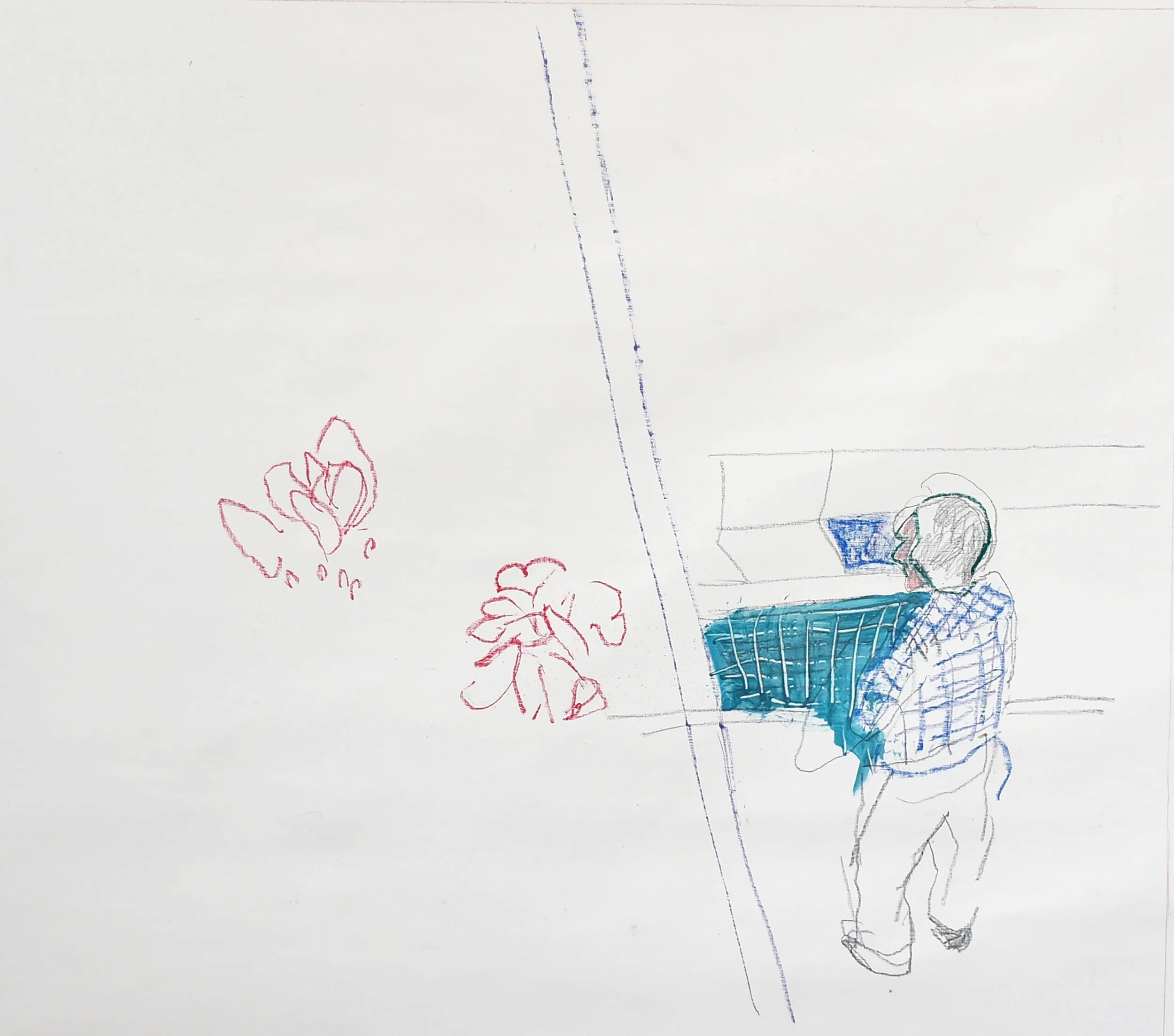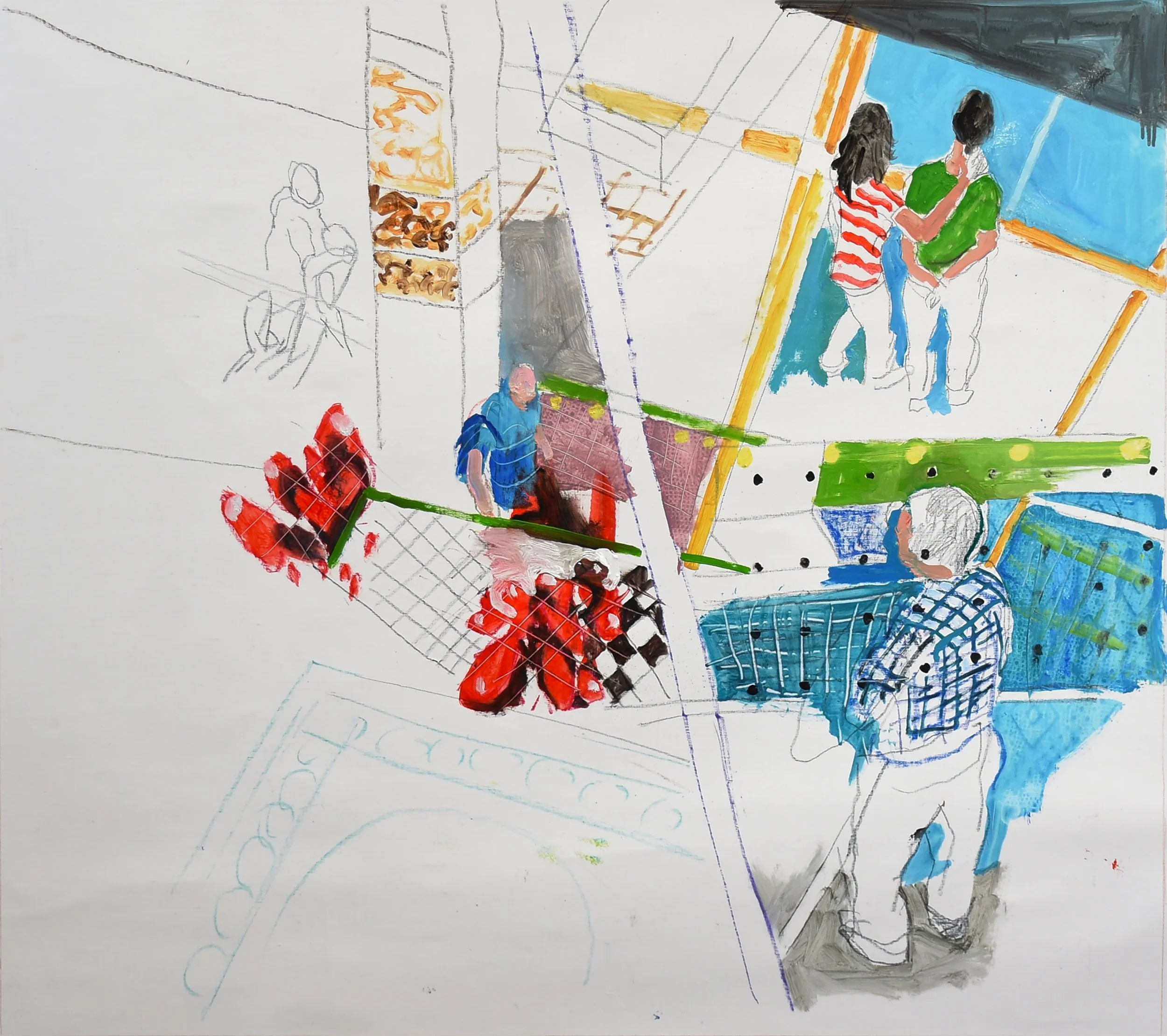 2:14 PM: i made a few slight but significant tweaks to "5/27/25 ano kato" today. i added a collaged piece on paper just behind the skateboarder’s behind, and added a deliniation of the handstander’s shoes.. other than that, the handstander and the colors surrounding him are perfect. and tat small piece of collaged paper is all that was needed to connect the right and left sides of the composition. for now, i’m not going to do any more, and see how i feel about it after having it up on my painting wall for a week or so. so tomorrow morning i’ll start something new.