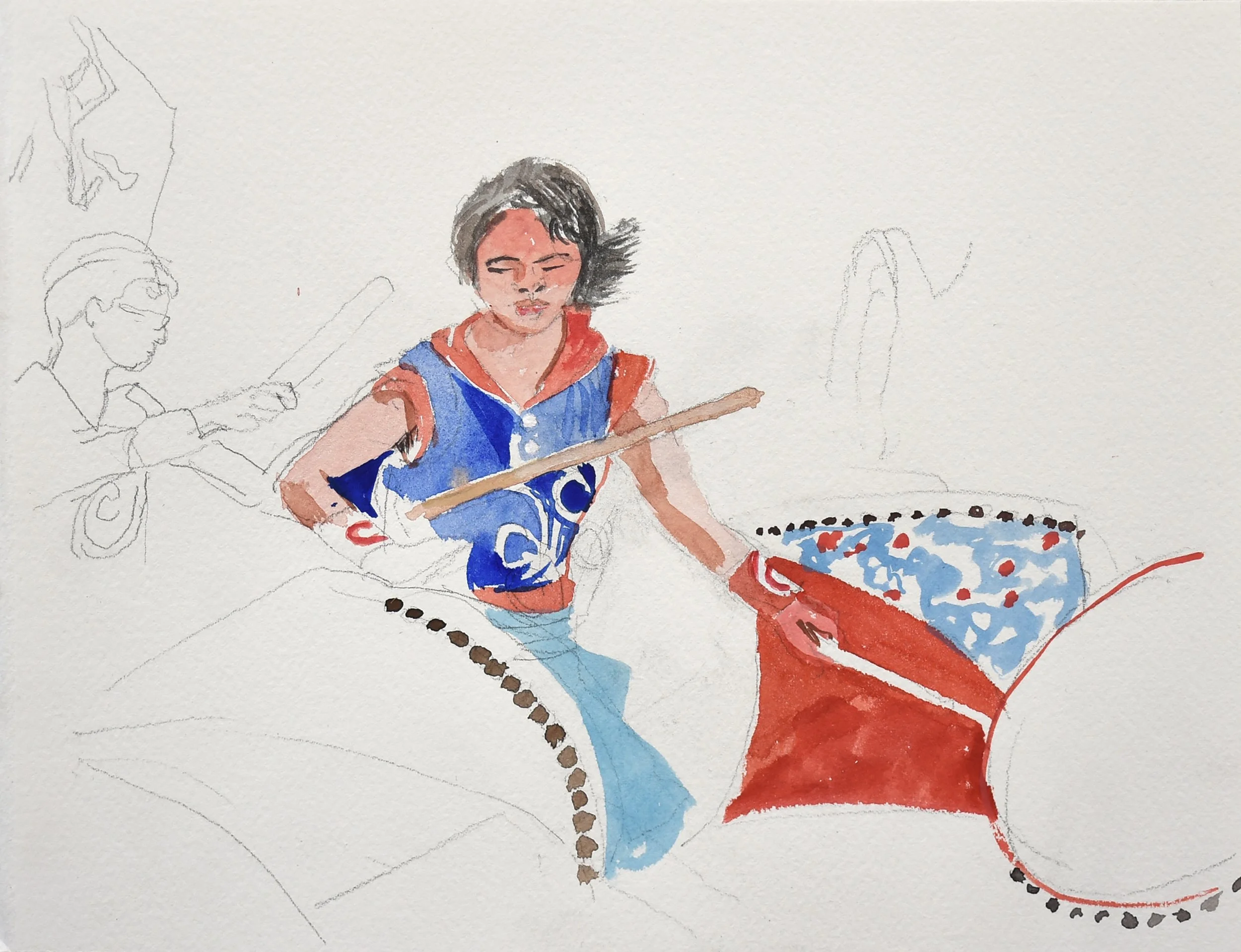 3:06 PM: yesterday afternoon, in between woring on 5/27/25 ano kato, i began work on this small (8 1/2 x 11”) watercolor-collage on paper. i continued this afternoon, introducing a karagiozis image of kolokotronis, the pre-eminent leader of the Greek war of Independence (1821-29) and a very interesting figure in Greek history. for those of you not familiar, karagiozis, he is a shadow theatre puppet and fictional character of greek folklore. when he was a kid, we often took our son dimitris to karagiozis performances in the athens neighborhood of plaka, where the famous spatharis shadow theatre was to be found.
