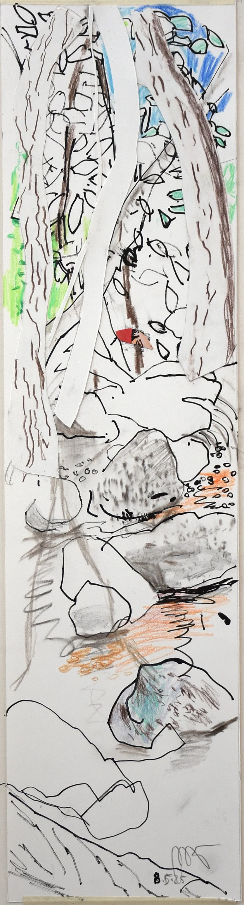 The preparatory marks in black & white and colored ink that i make and then cut into pieces before i start a new collage play a vital role. the variety of marks; some made with bambool pen, others with various size fan brushes, give me an array of possibilities. where and when i collage them is purely a gut feeling, taking into account the entire composition but without plotting and planning.