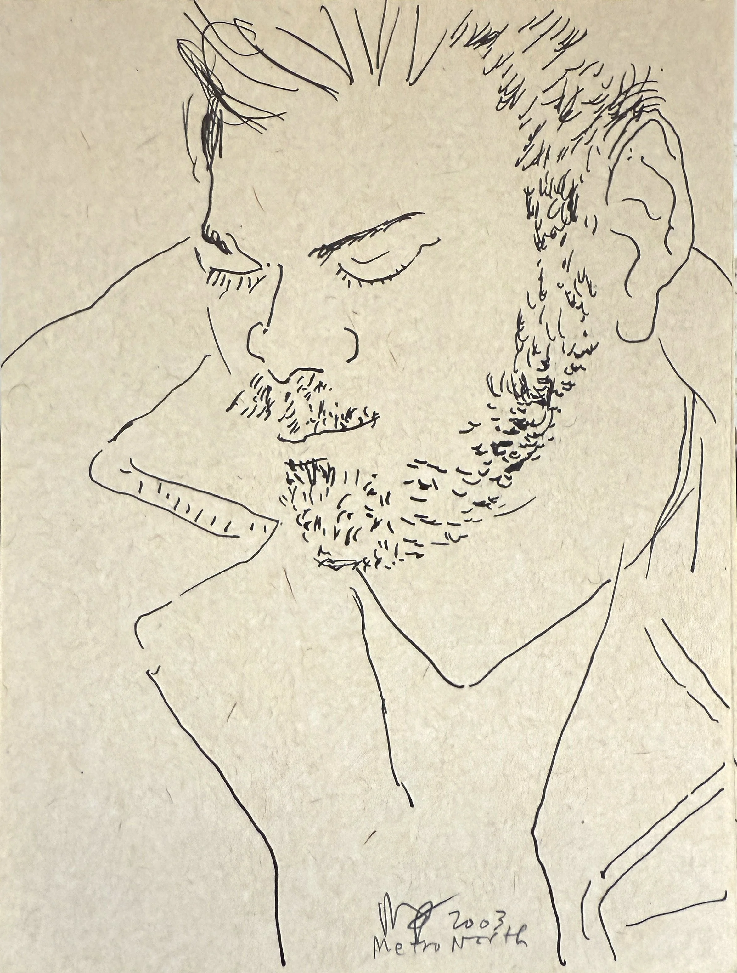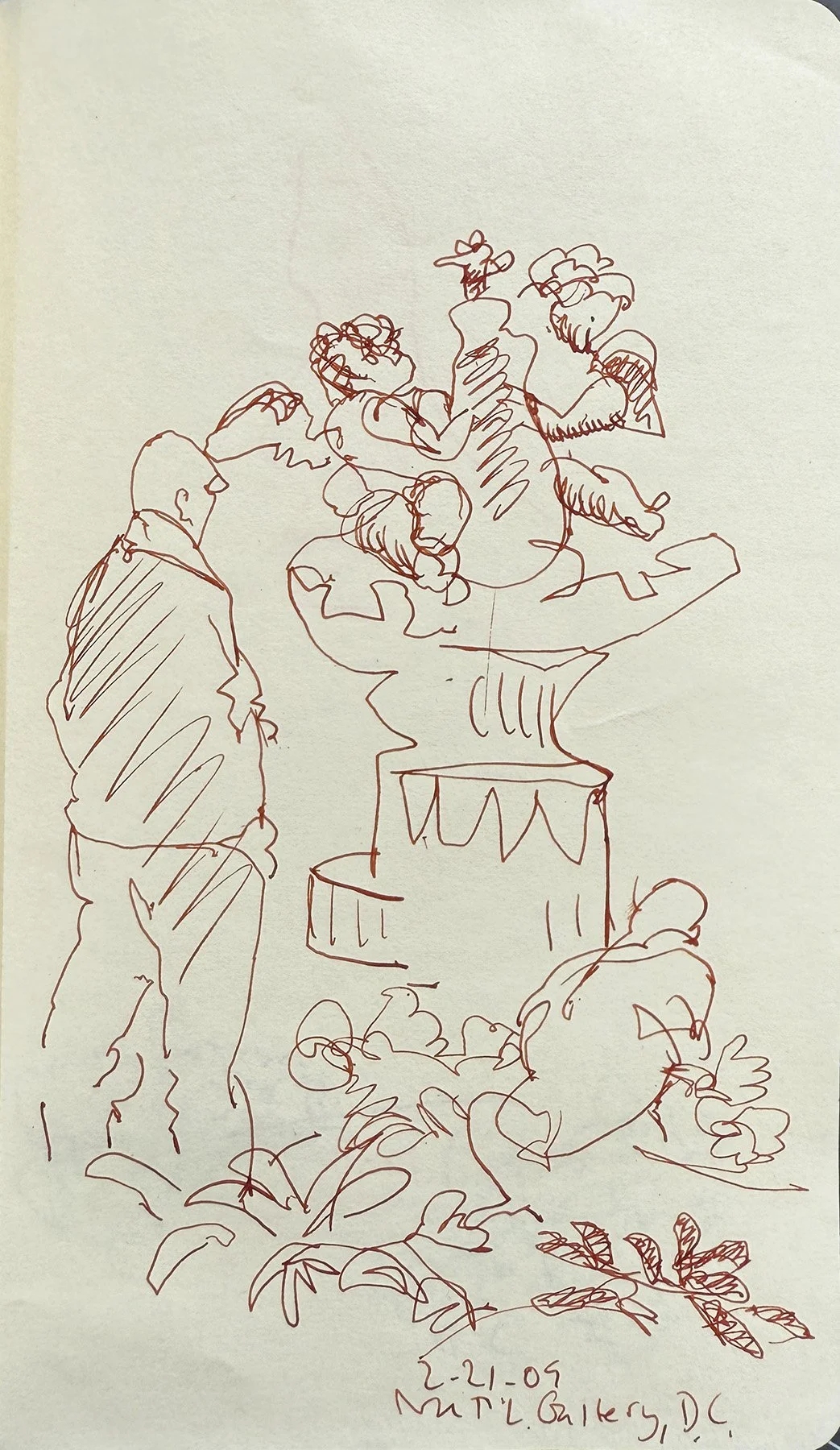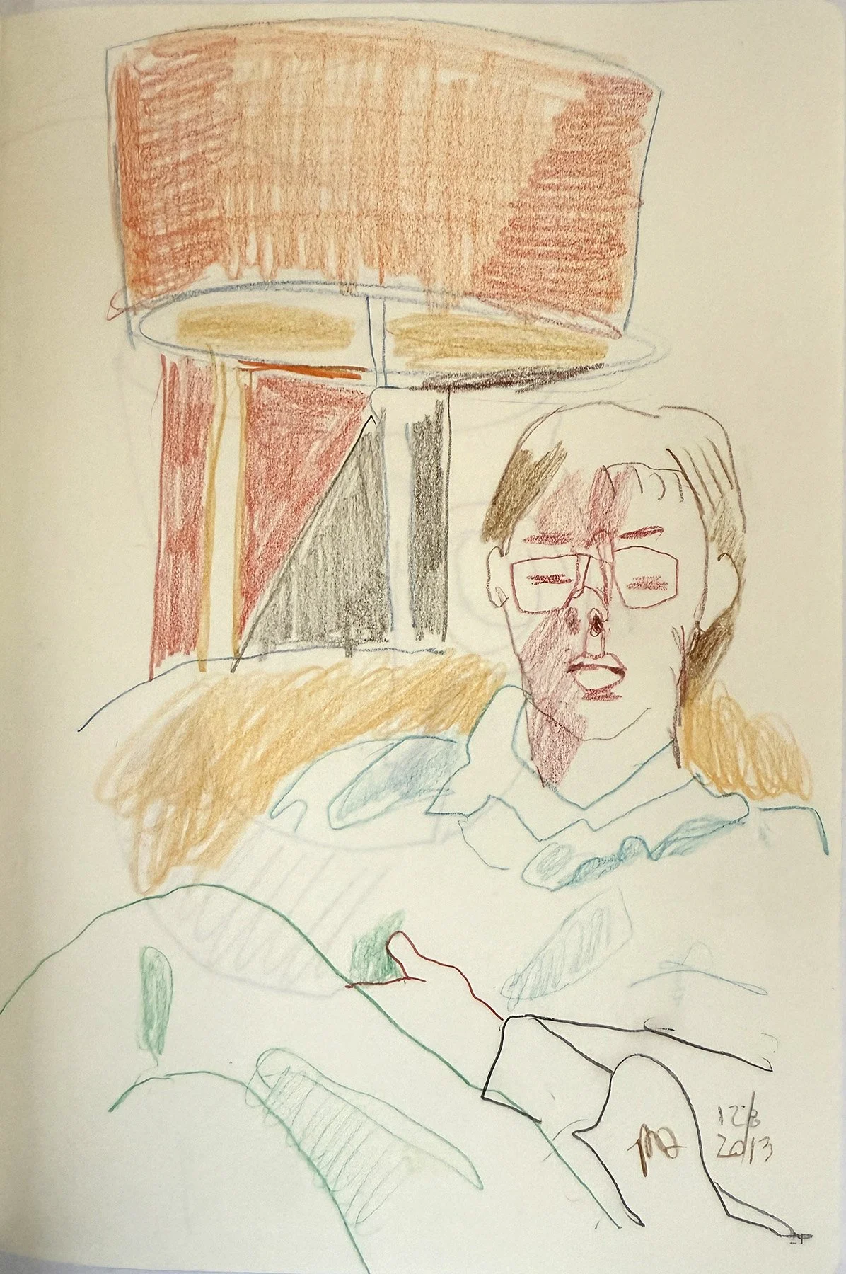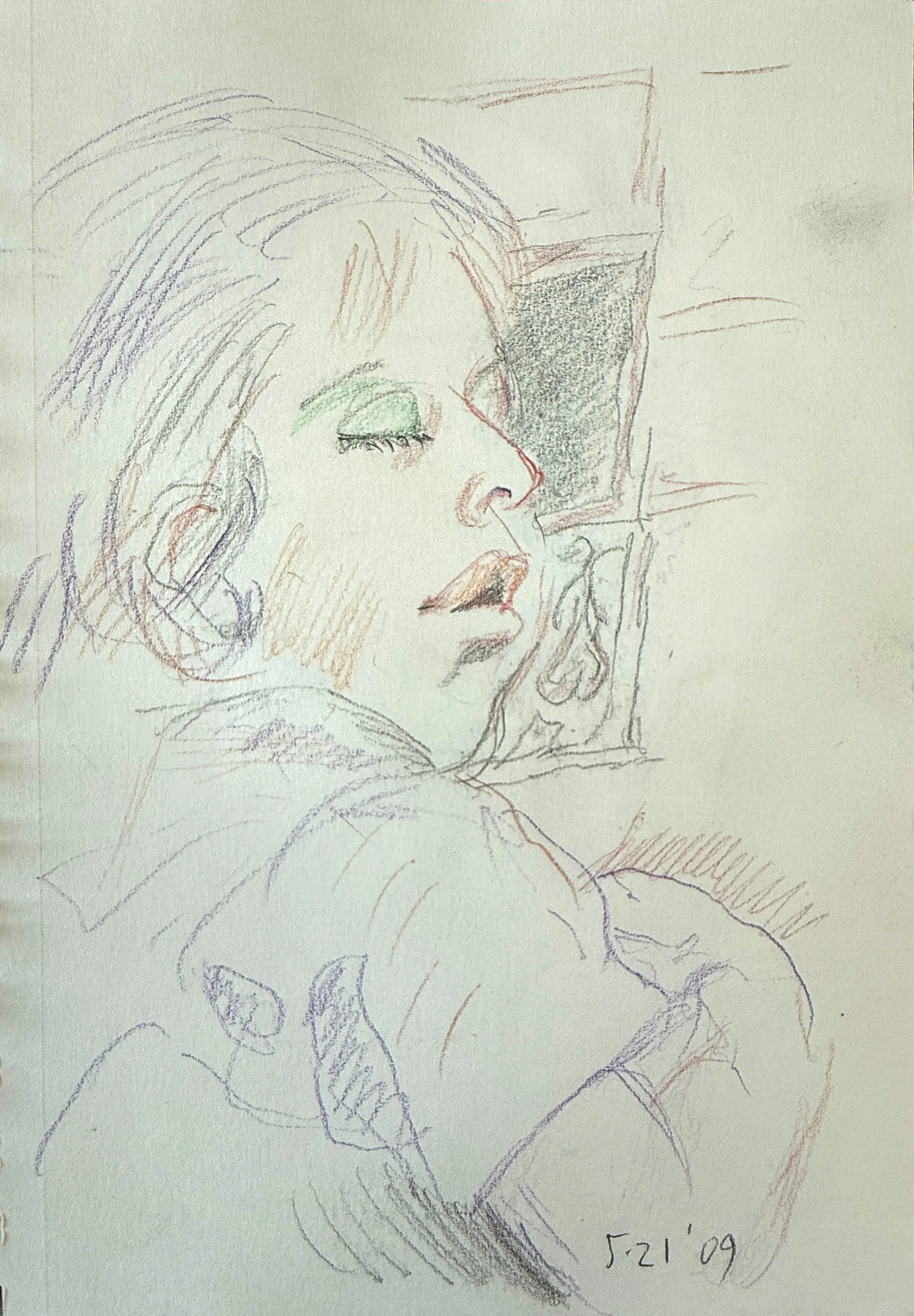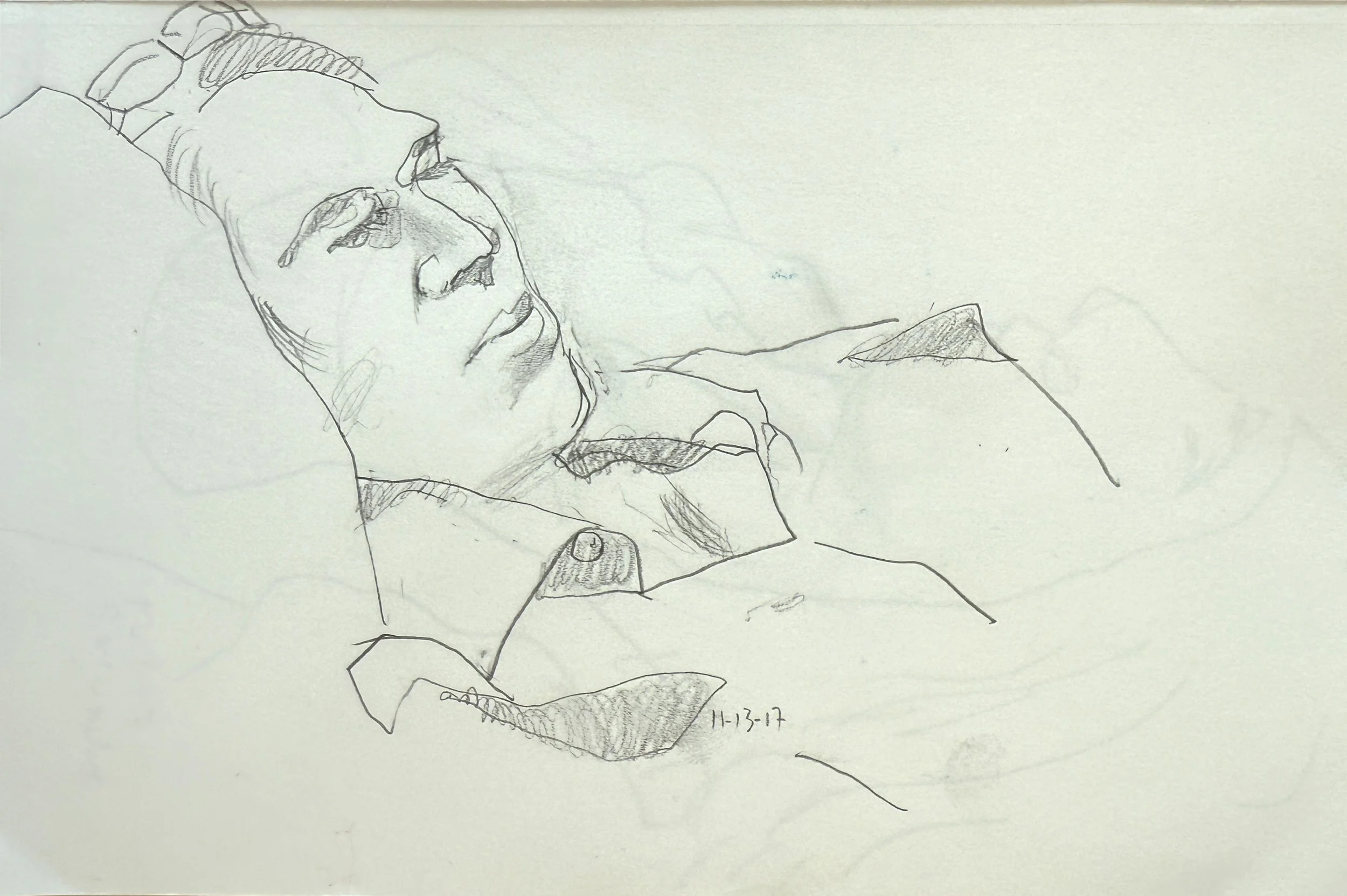so this time when it reached that point, i was inspired to take a piece of 8.5x11 paper and make a drawing of one of my favorite images. it’s one that has appeared in many of my recent works, of a couple seen from behind and slightly above. she’s got her arm around him, with her hand on his neck and his arms are folded behind him.