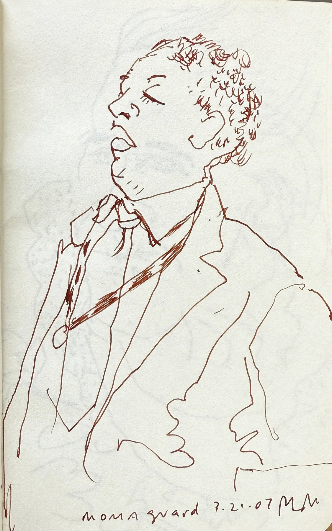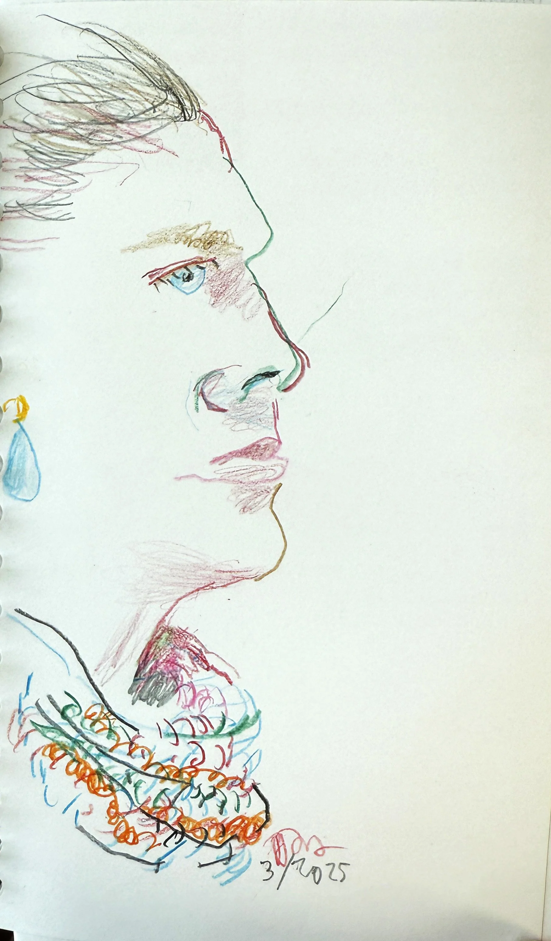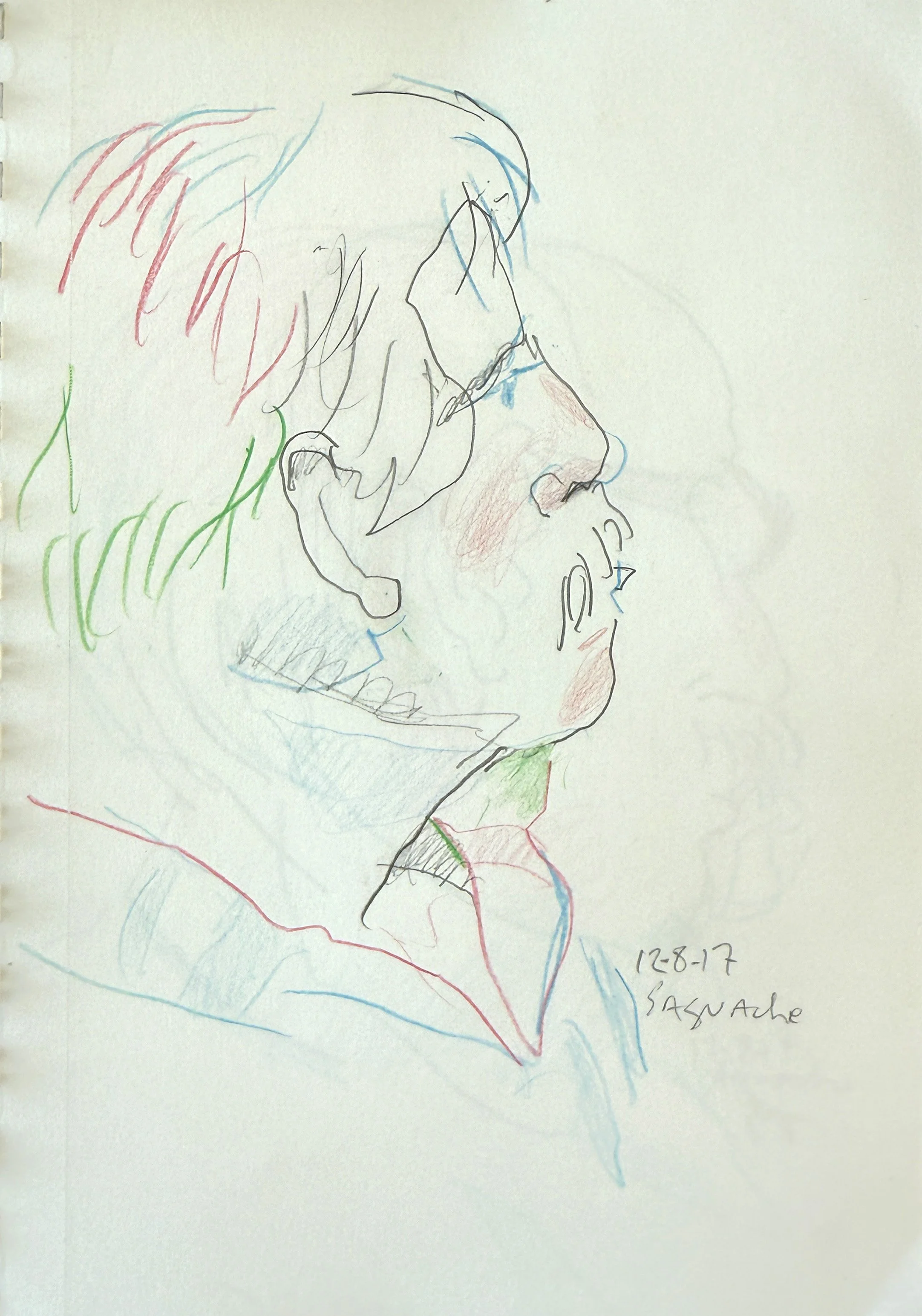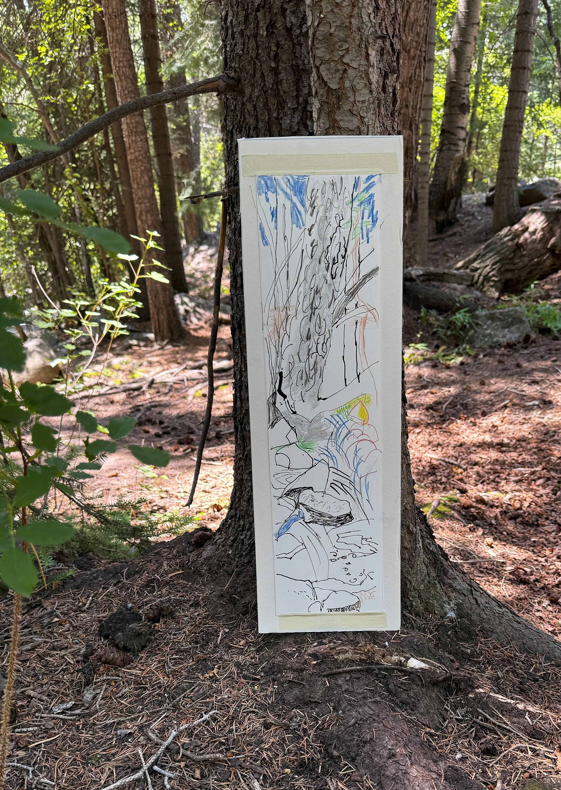 so this time when it reached that point, i was inspired to take a piece of 8.5x11 paper and make a drawing of one of my favorite images. it’s one that has appeared in many of my recent works, of a couple seen from behind and slightly above. she’s got her arm around him, with her hand on his neck and his arms are folded behind him.