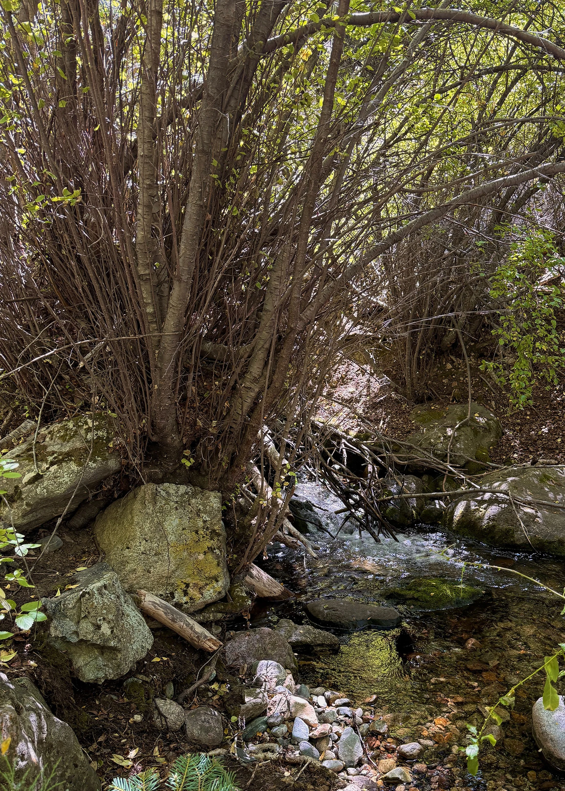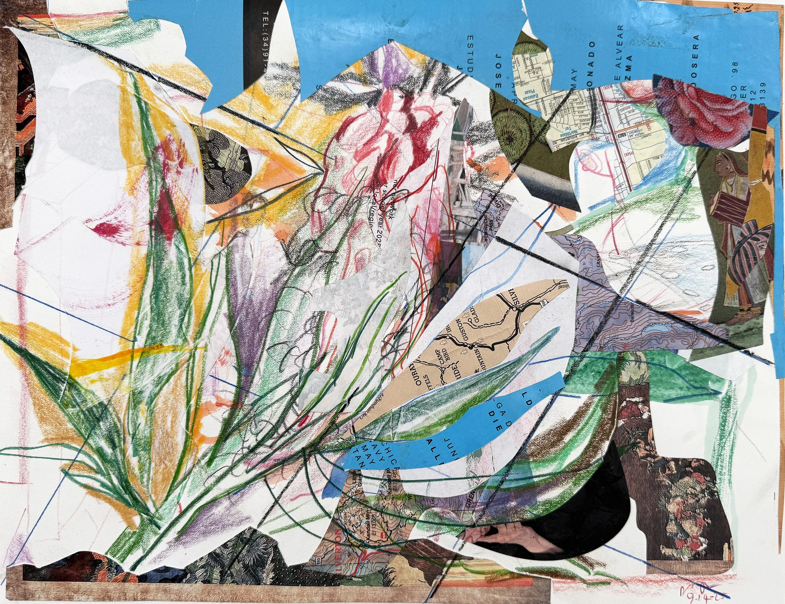 2:42 PM: today o took "9/13/25 colored pencil/collage" to the next stage, making quite a few changes and additions, using both collage and colored pencil. the piece now has a geometric framework. a familiar plant has appeared, it’s green leaves spreading up into the composition. and blue collaged paper now gives the impression of a sky, making all that lies below into a kind of landscape. the red flower i started with yesterday remains in the upper central portion of the composition. this piece stands out in it’s boldness when placed next to other recent works, while clearly belonging to the same stream of visual sensability.