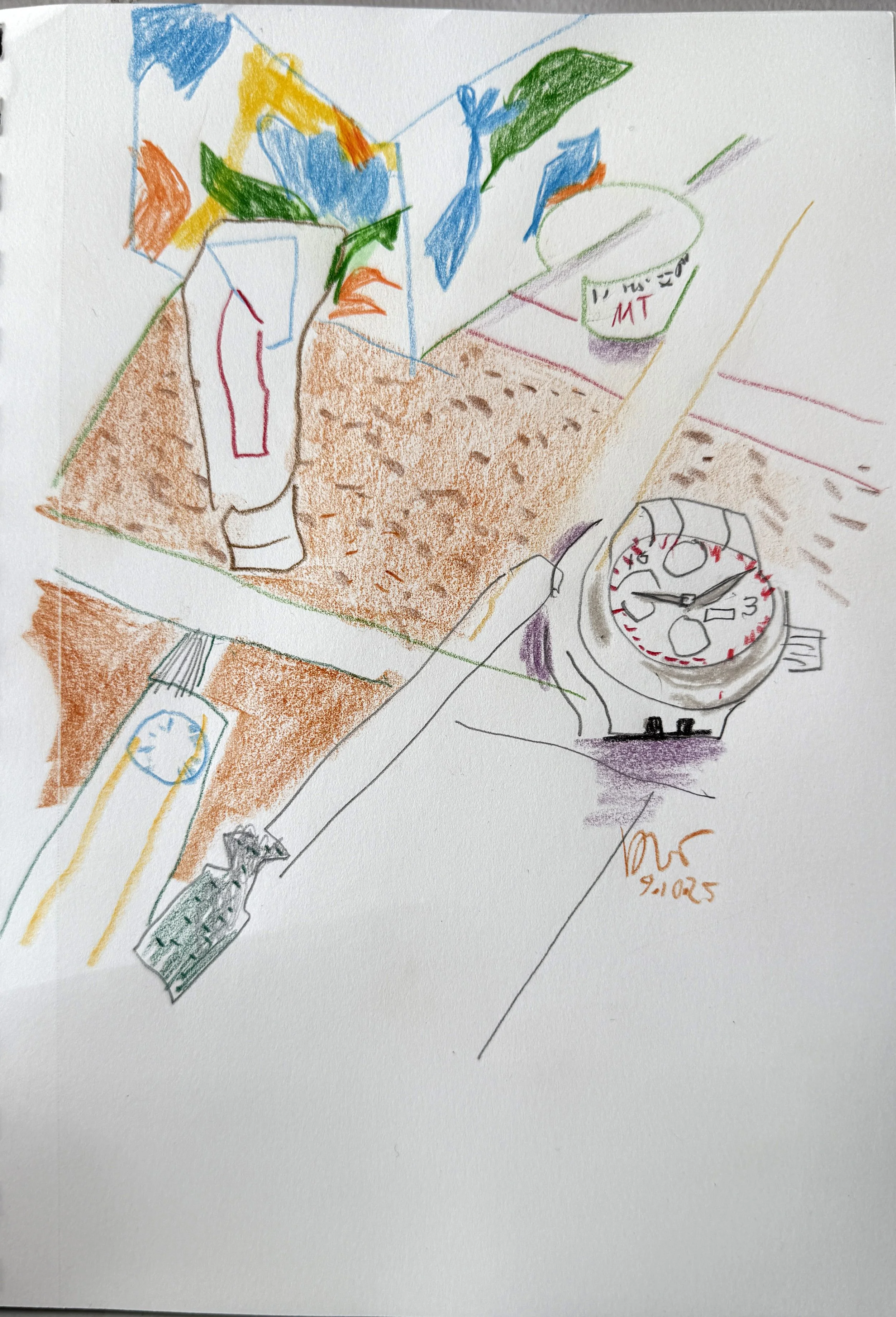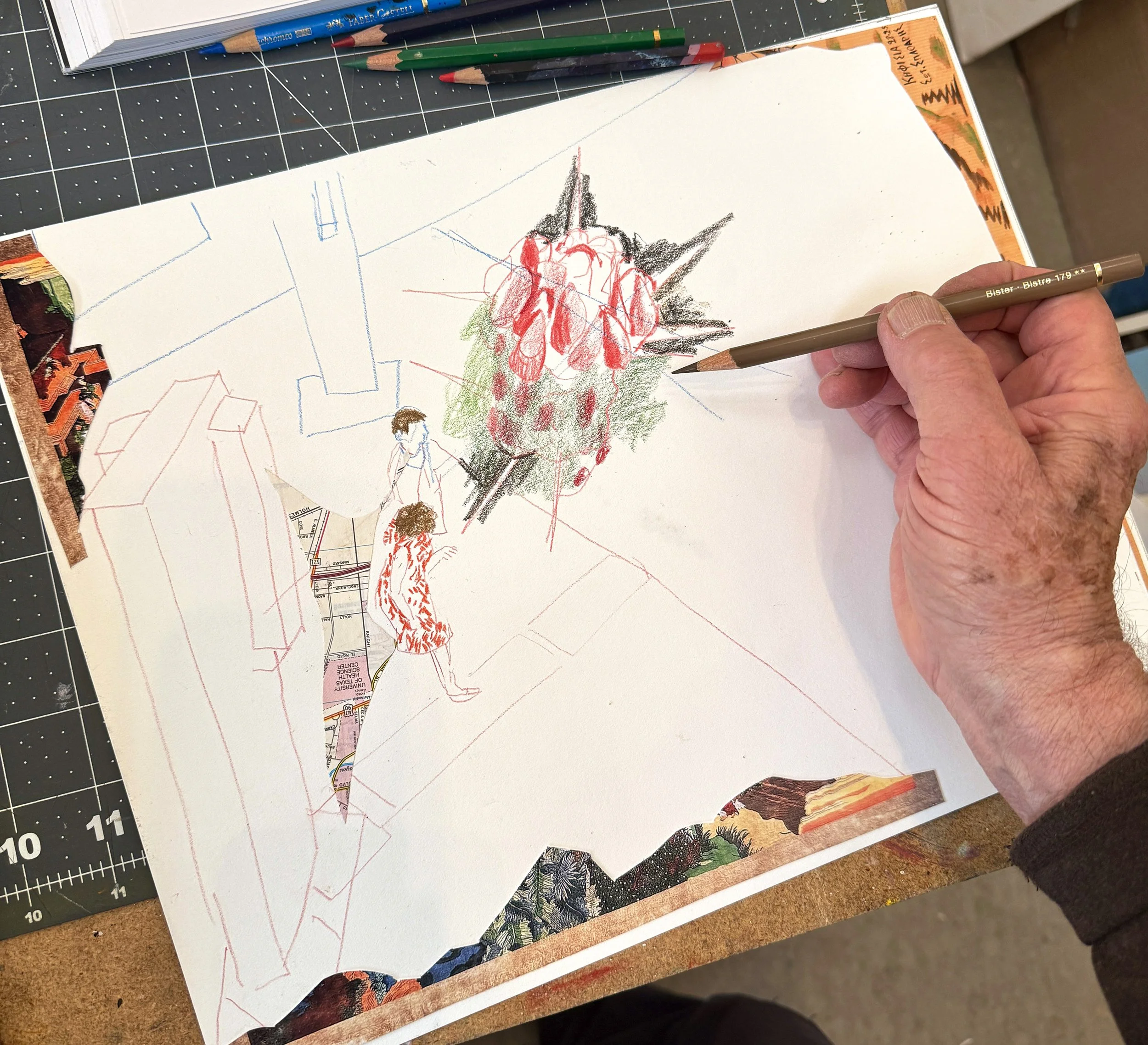 BELOW: 9/13/25 colored pencil/collage yesterday and today