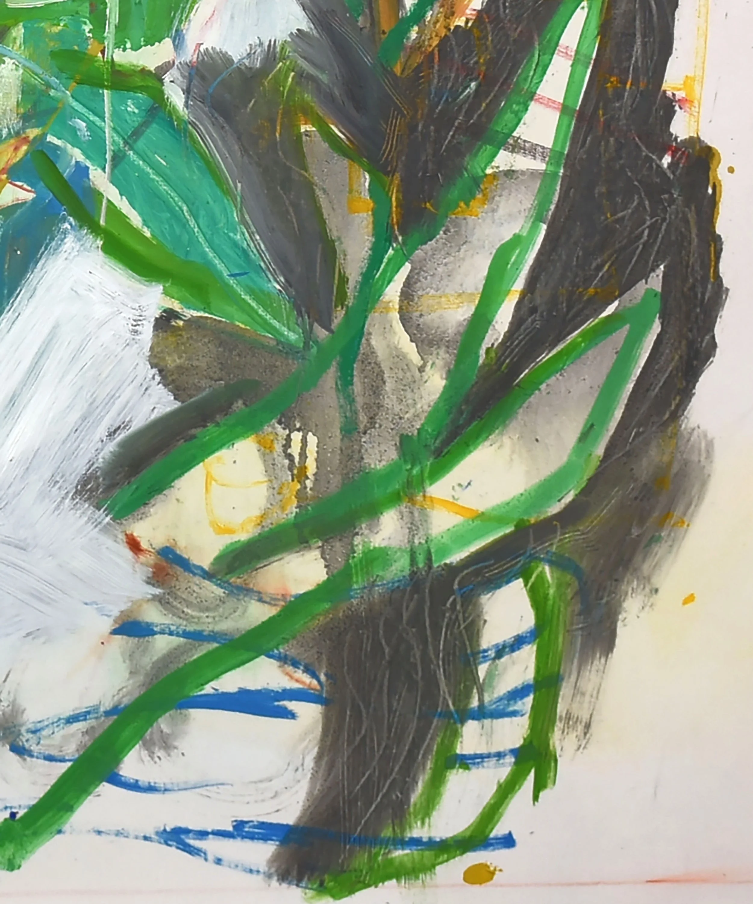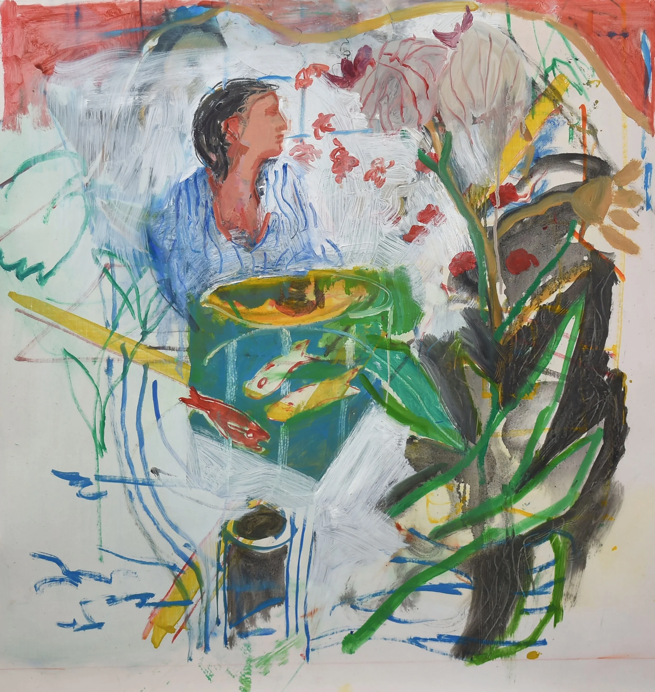 this solution integrates my love of figures viewed from above with my love of painterly solutions and the mystery of an underlying composition peeking through. the fact that she’s walking on pavement is subtly indicated by the few vertical and horizontal marks scraped into the grey with a palette knife.