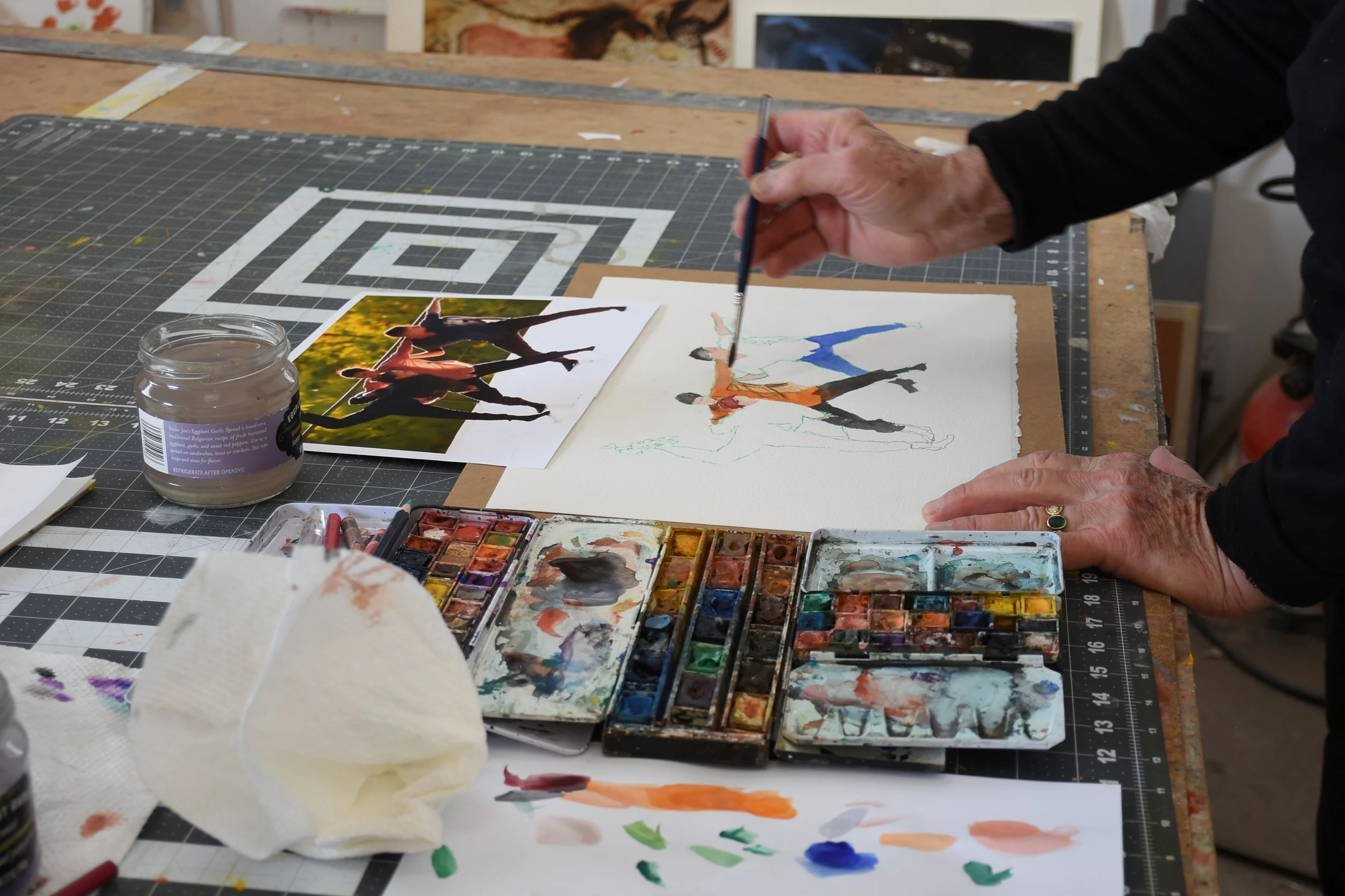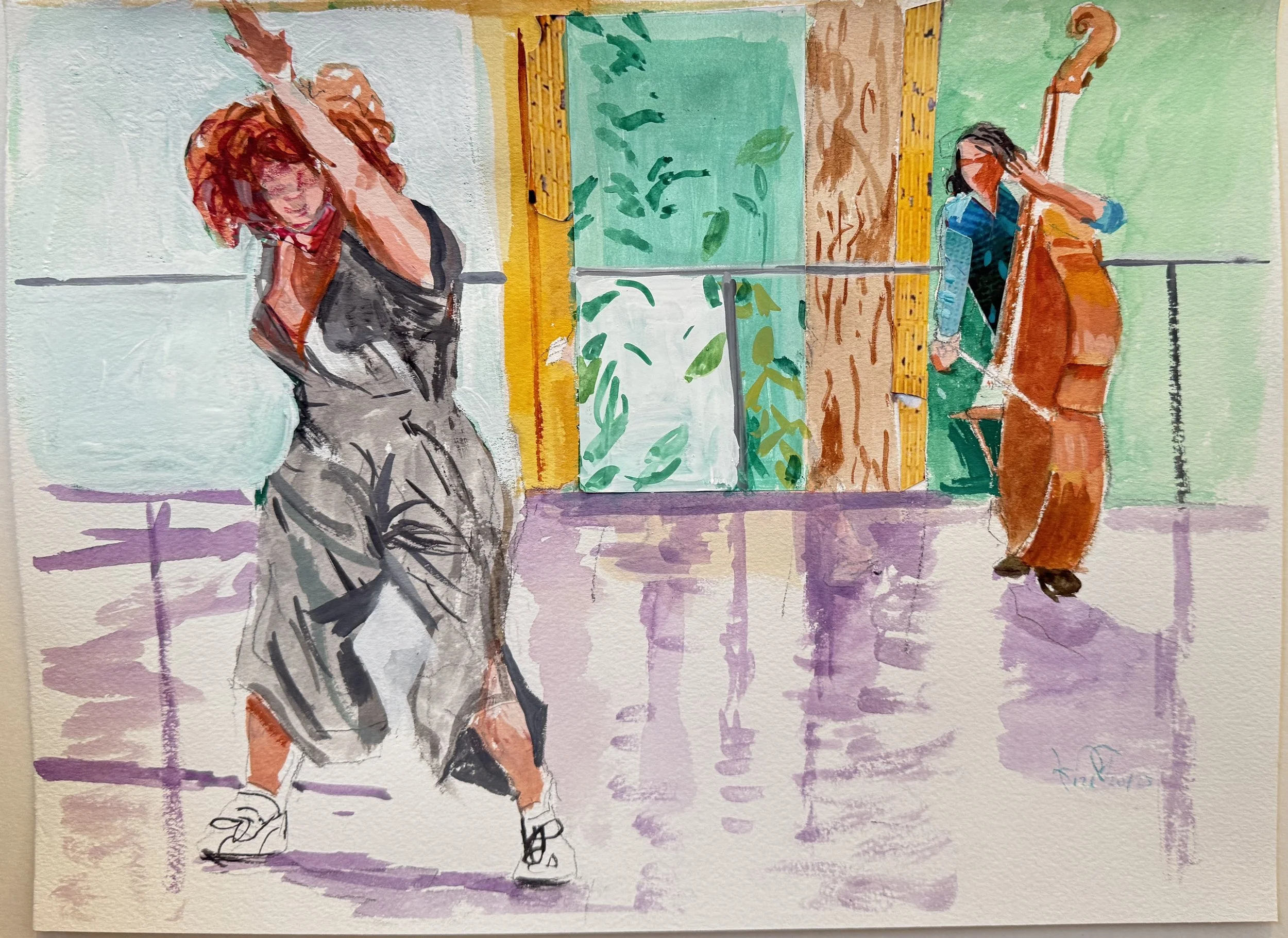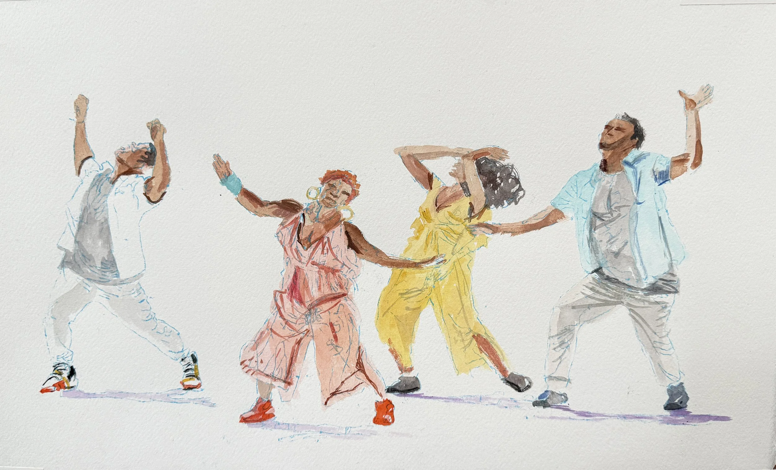 jacobs pillow 10 contains 7 dancing figures, and today’s jacobs pillow 11 contains four of those seven, allowing each of the four to have a lot more detail. this entire series thus far has been a journey. with each progressive watercolor/gouache i’m getting more of a feel for the dancers and how they throw themselves body and sould into their movements.