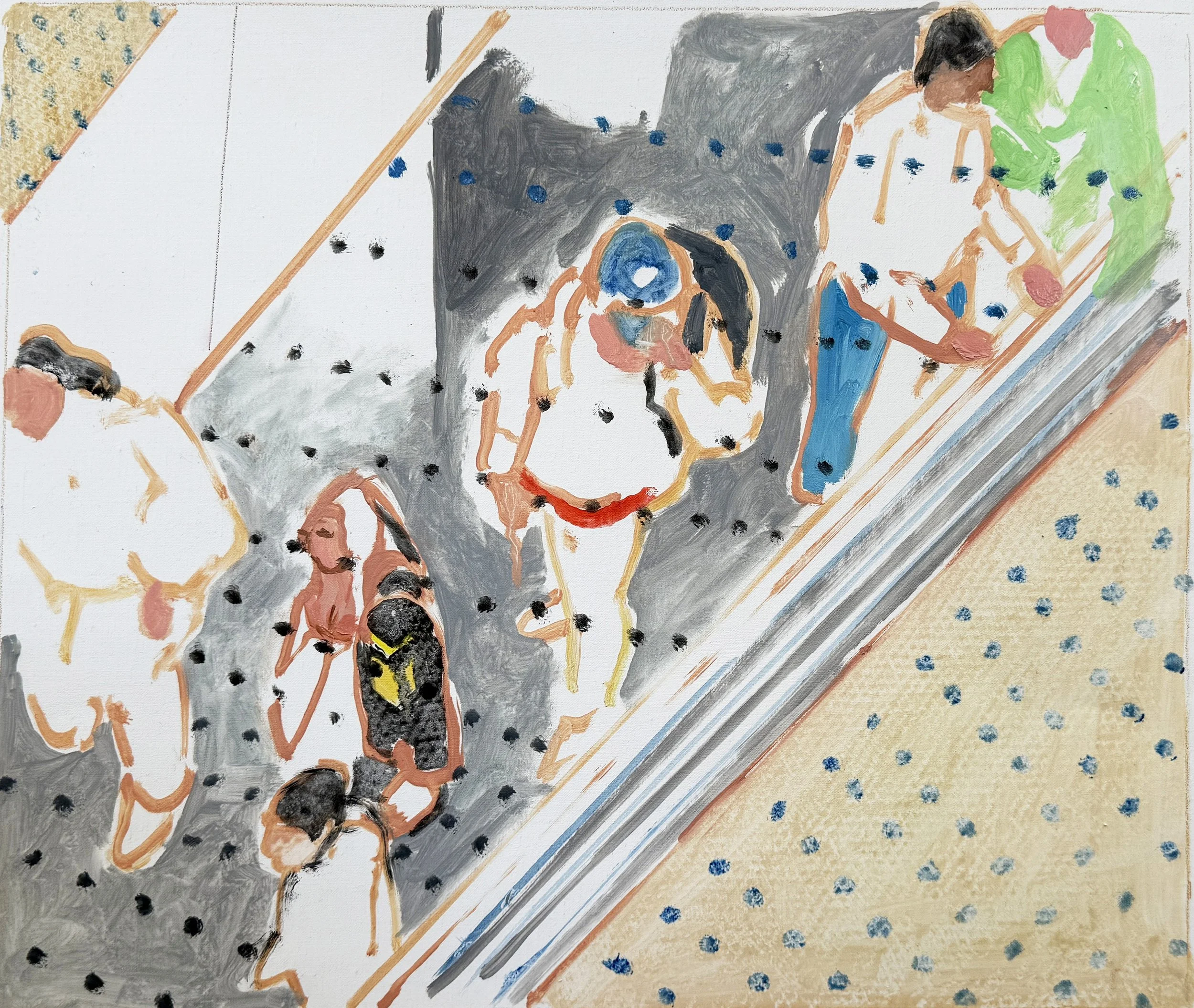 2:29 PM: thjis afternoon i started work on the first of the seven 14x15 1/2” pieces of portrait linen i discovered while cleaning up a few days ago. titled passing through, it was inspired by a photo i shot at least 5 years ago while looking down at wlking figures, from an upper area of a mall, likely in denver. it may be complete; i’ll know tomorrow morning when i have a fresh look at it.