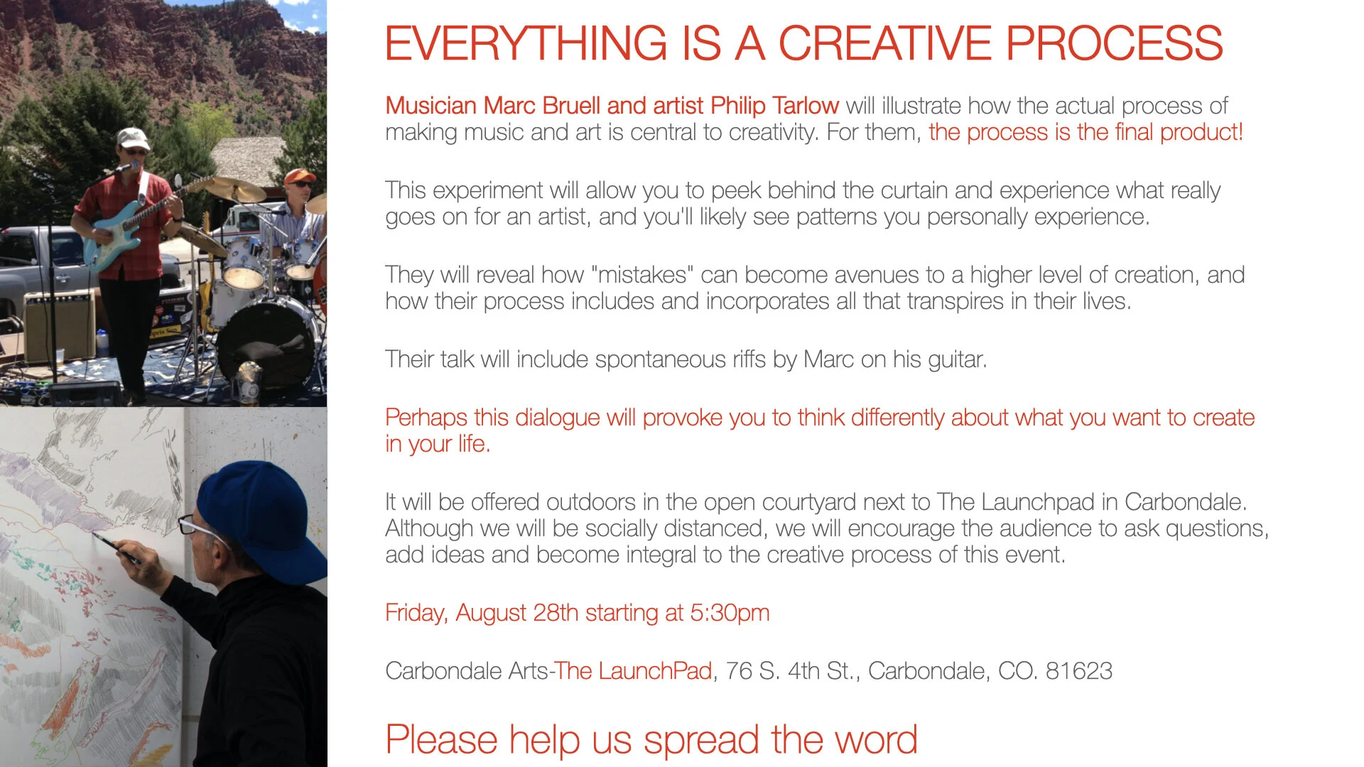 THE BROCHURE FOR OUR AUGUAST 21 OUTDOOR TALK AT CARBONDALE ARTS