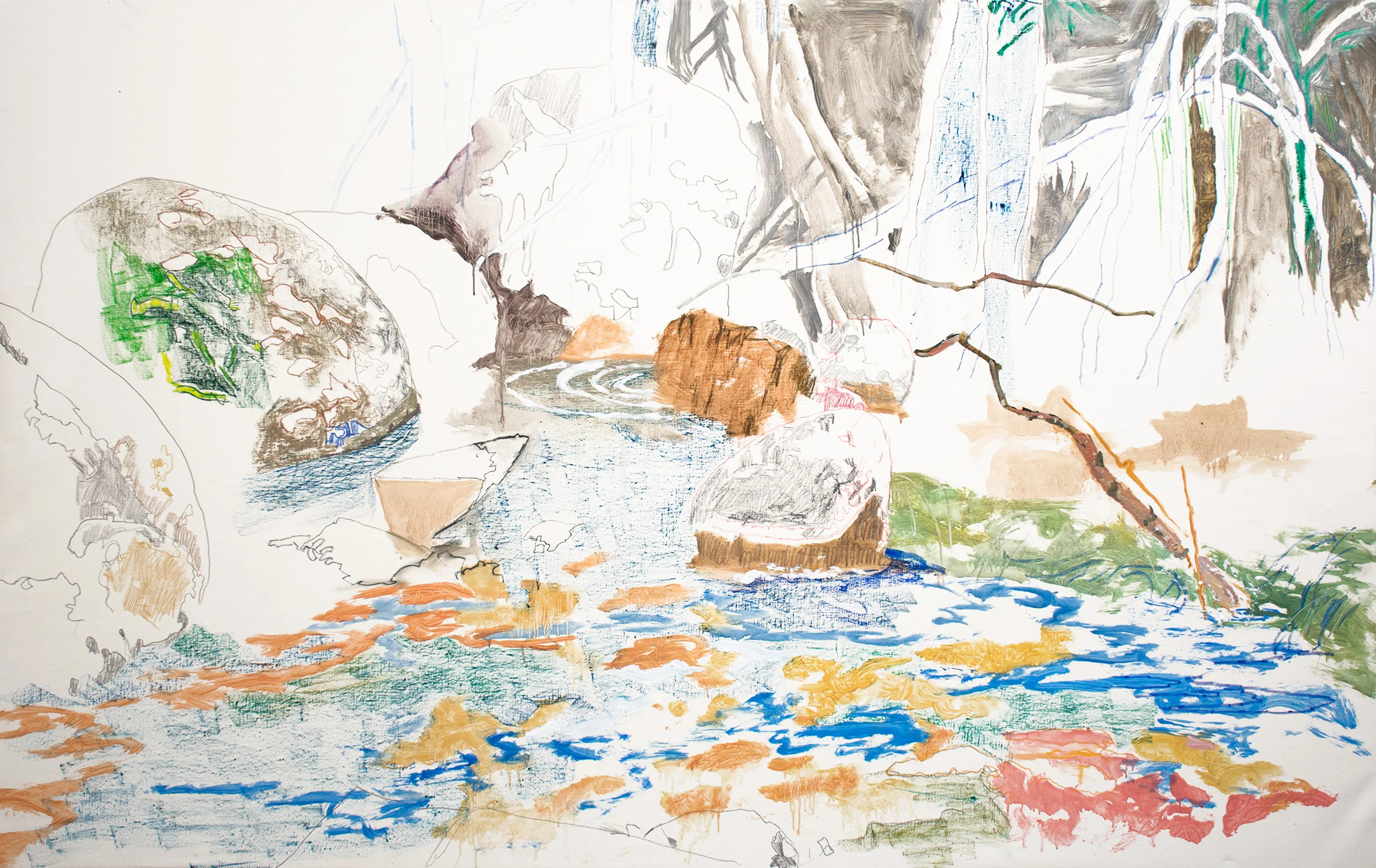 dp creek III, 42 x 66” oil, oil stick colored pencil on portrait linen, 2019, private collection, carbondale, colorado
