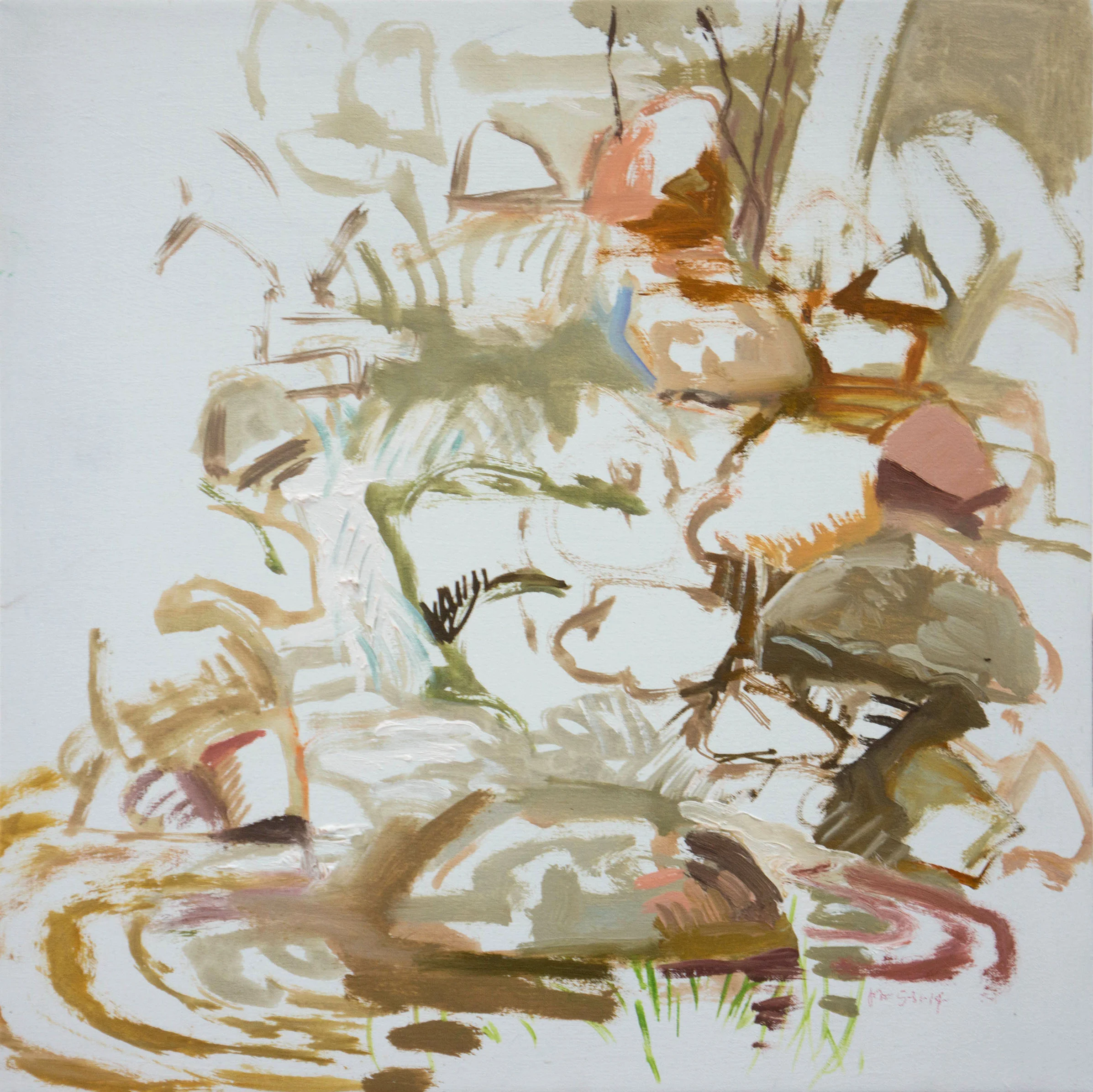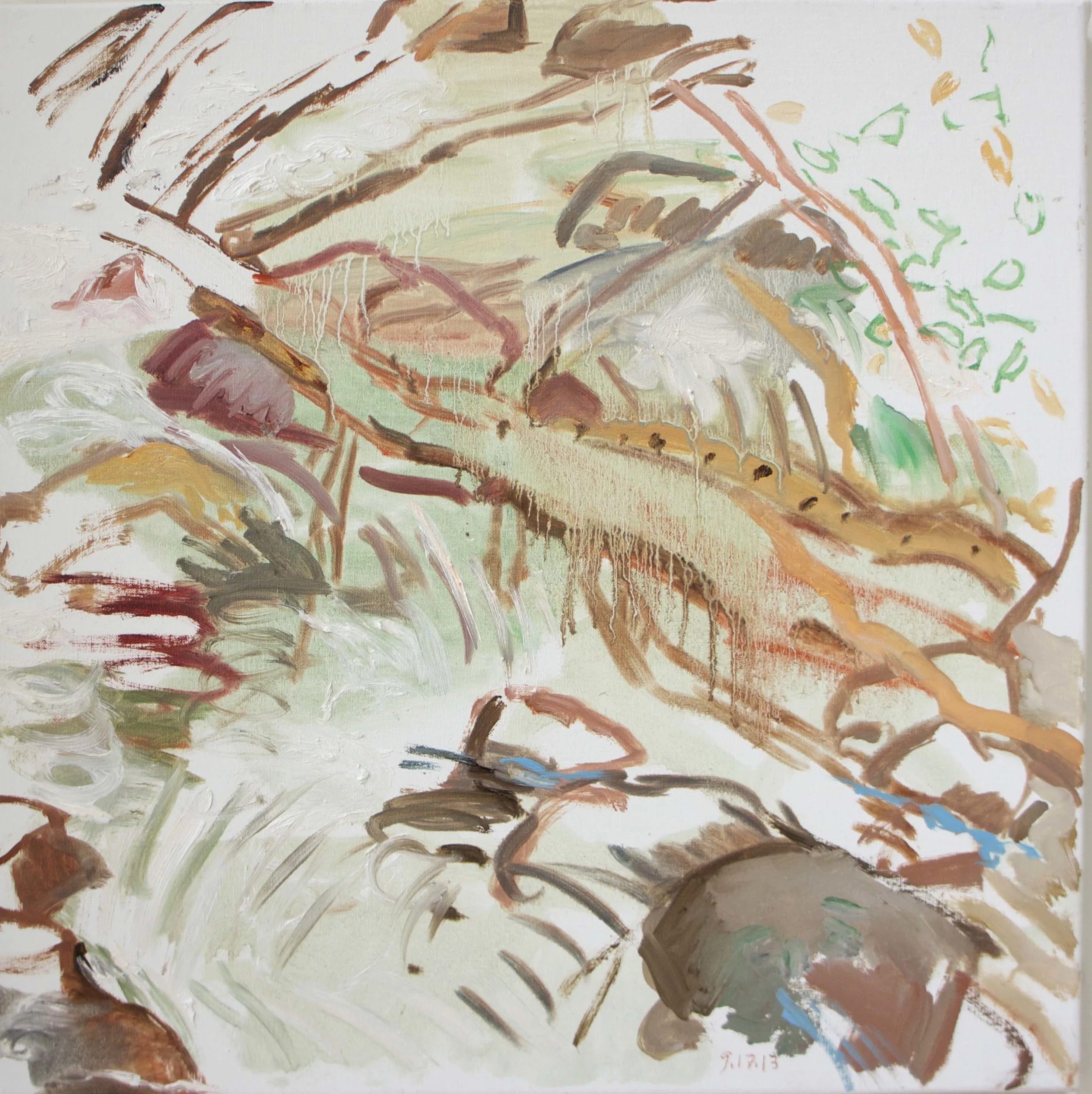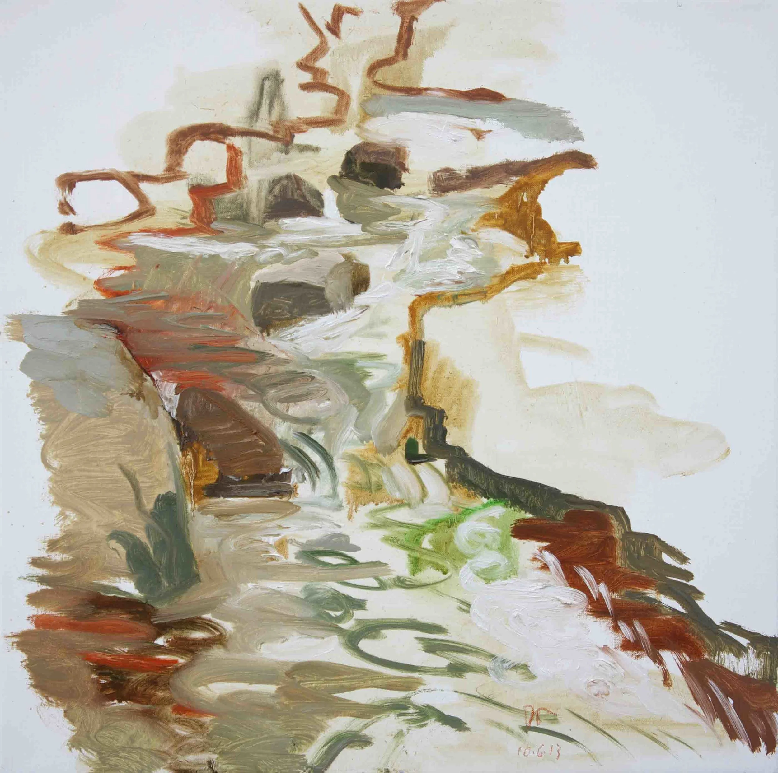 this ongoing series is the inspiration for my larger abstracted studio works. (visit the recent collages page). over the past decade, they've become less descriptive, more calligraphic & painterly. gradually, a "language" is evolving. an alphabet of signs, a distillation of my particular gestures in response to the creek: how i move my body, arm, wrist...my SIGNATURE SHAPES evoked by my visceral responses. these are always colored by my store of images from works by artists i love: from jacob van ruisdale to huang tingjian and lucien freud.....