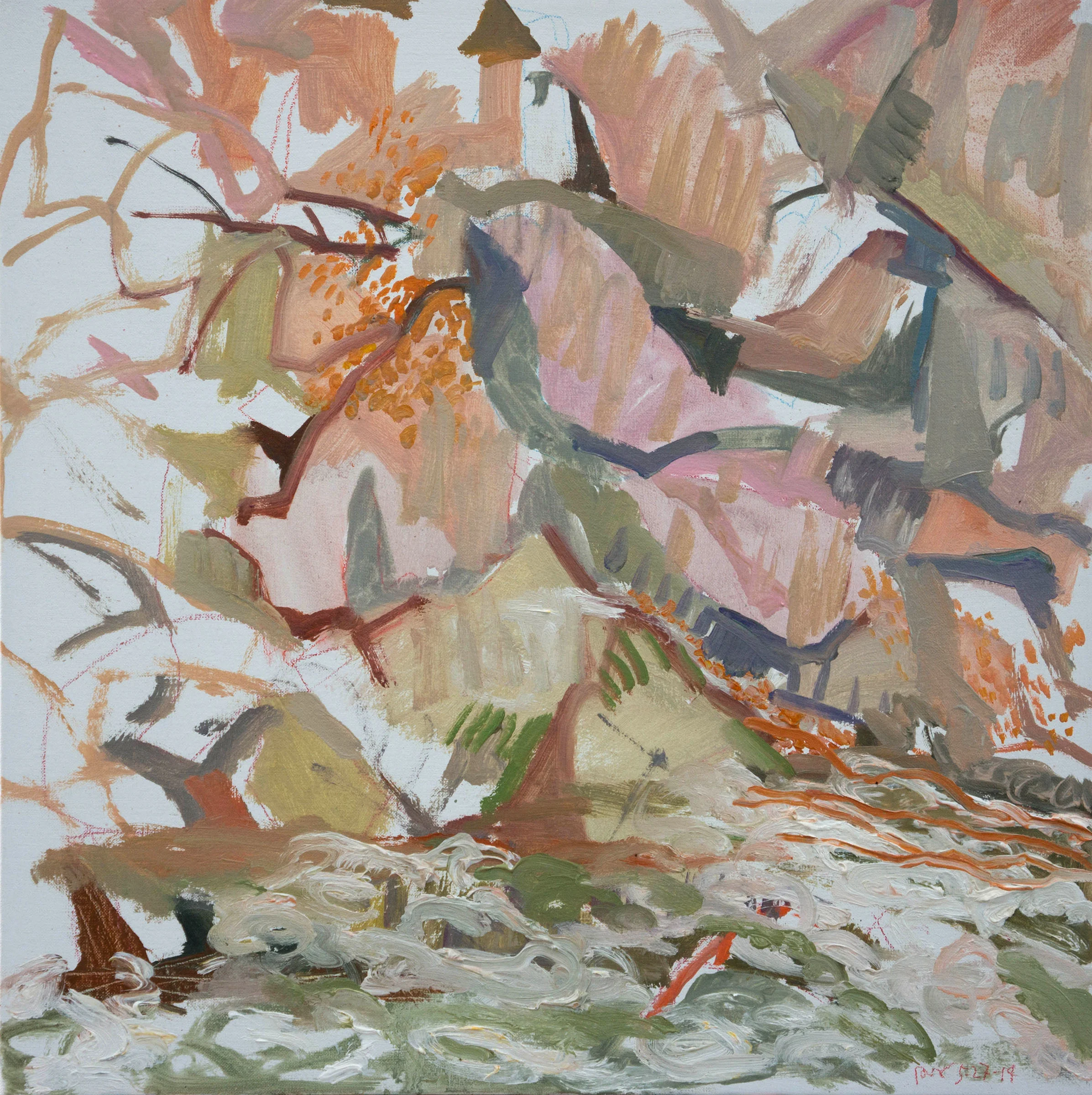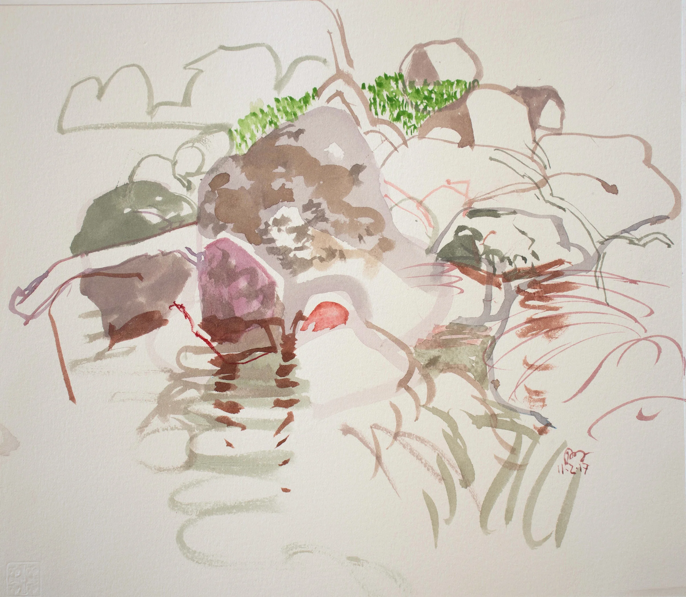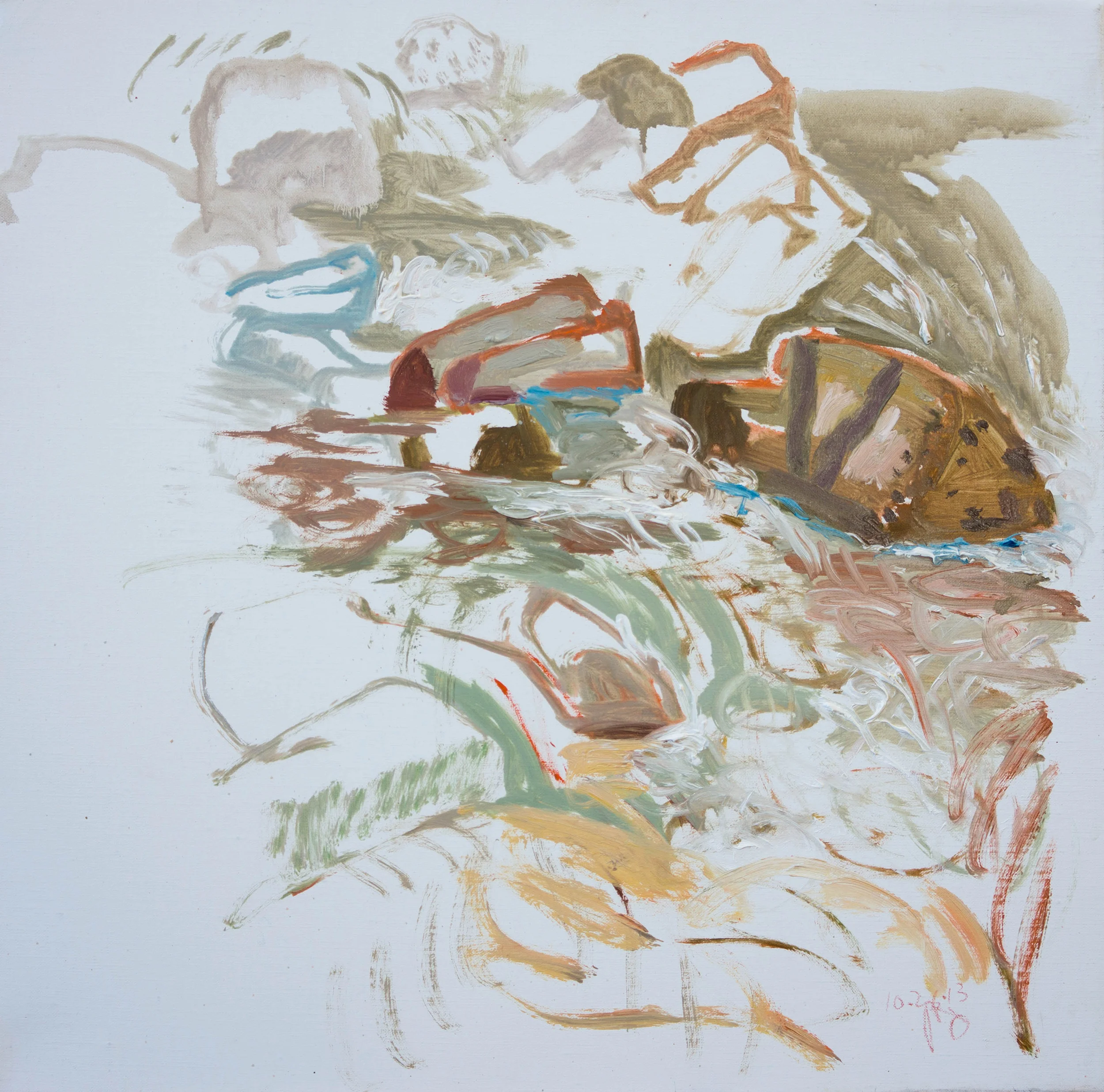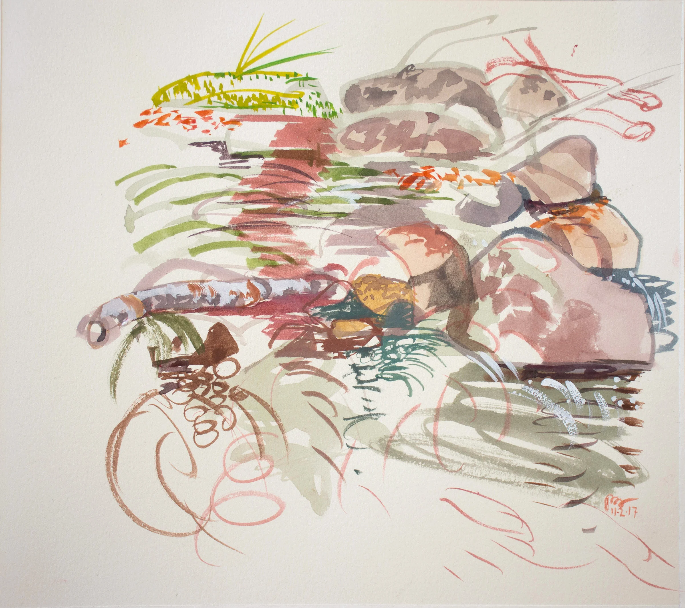 this ongoing series is the inspiration for my larger abstracted studio works. (visit the recent collages page). over the past decade, they've become less descriptive, more calligraphic & painterly. gradually, a "language" is evolving. an alphabet of signs, a distillation of my particular gestures in response to the creek: how i move my body, arm, wrist...my SIGNATURE SHAPES evoked by my visceral responses. these are always colored by my store of images from works by artists i love: from jacob van ruisdale to huang tingjian and lucien freud.....