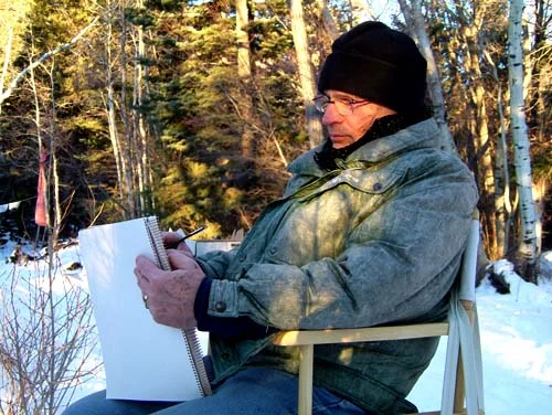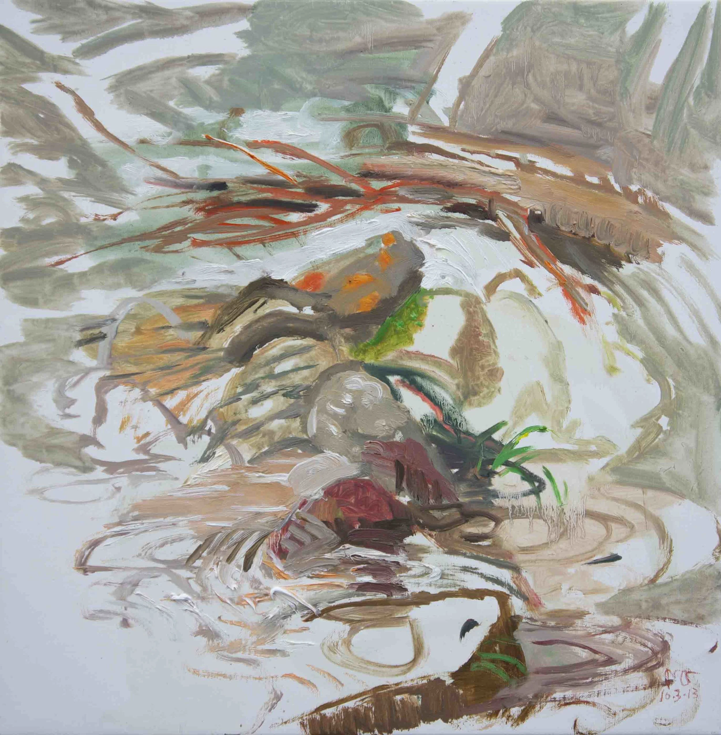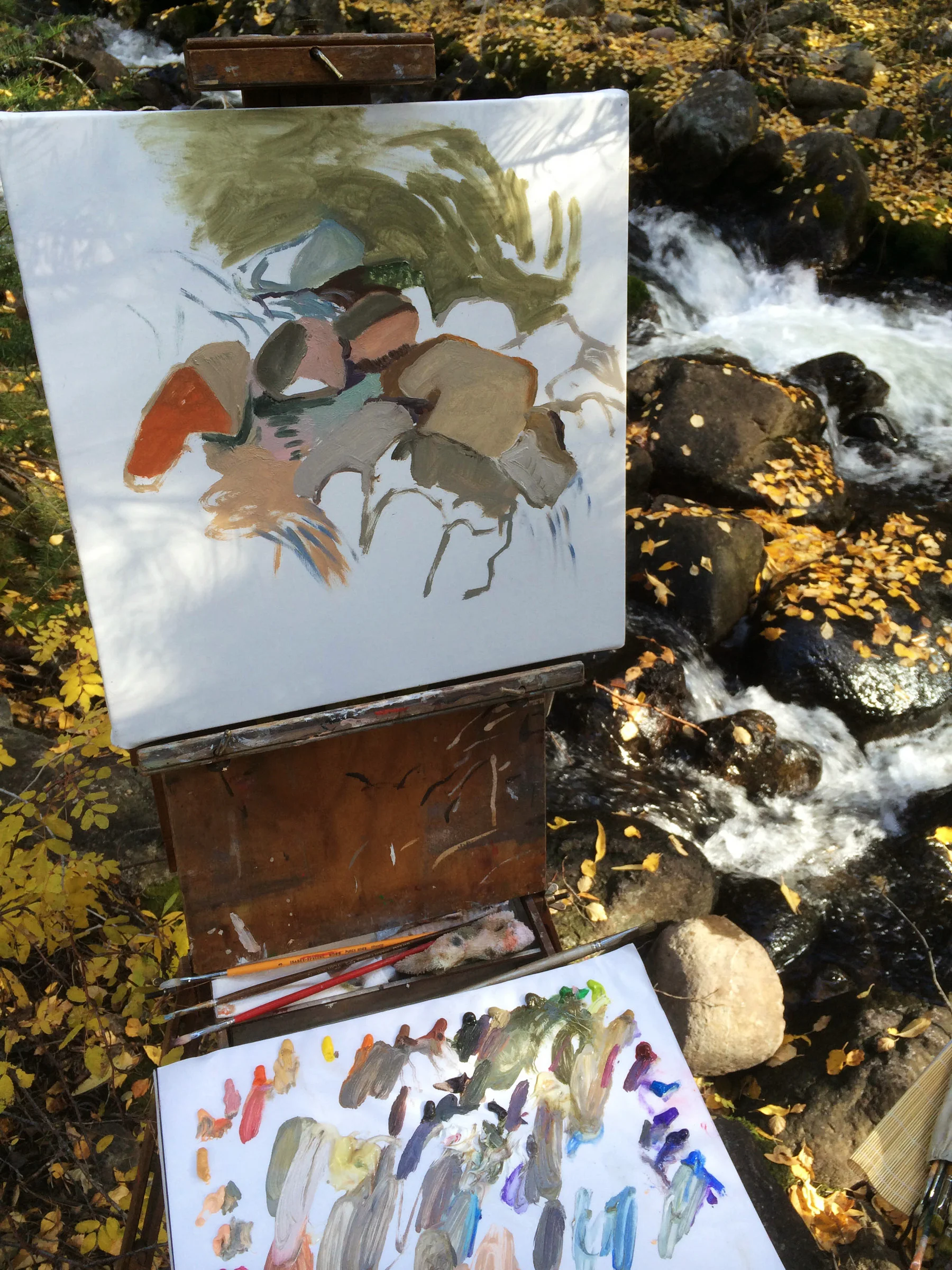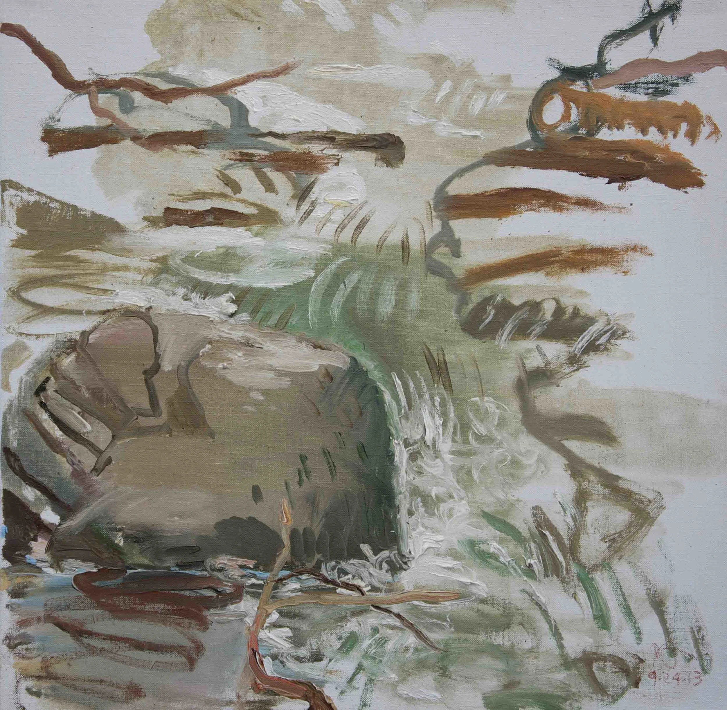 the plein air paintings are all executed at nearby creeks in one sitting, usually an hour or less, in oil on portrait linen. the setting: very remote and primal. the creek rushes over the rocks and branches with a loud, unbroken rushing roar. at times it's like murmuring human voices.